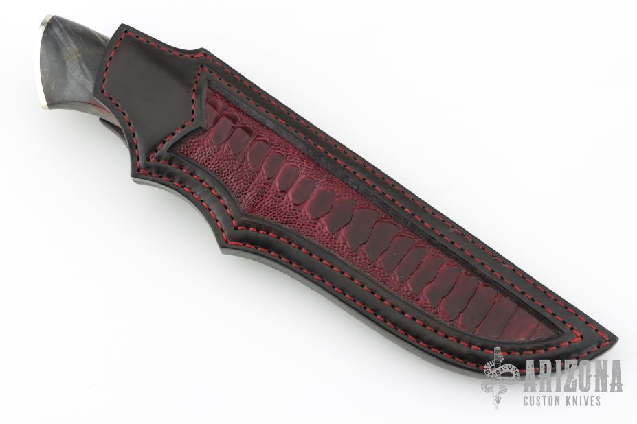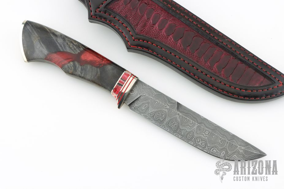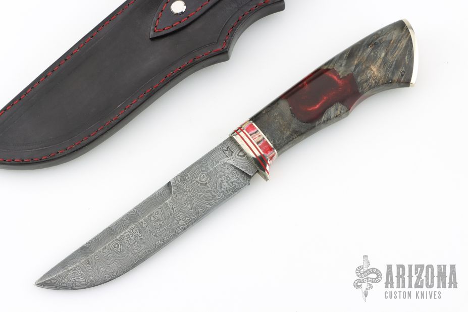 This Hunter by Marin Soóš features a 1000 layer Carbon Damascus blade with false top edge, .159" blade stock and 1.227" blade depth, hidden tang construction. The handle has a nickel silver and red guard, stabilized maple and red acrylic grip, mammoth tooth/nickel silver spacers, textured nickel silver butt. Comes with a COA and a black leather sheath with red ostrich leg skin inlay. New from maker. Comes with a COA dated 10/20/2025.