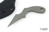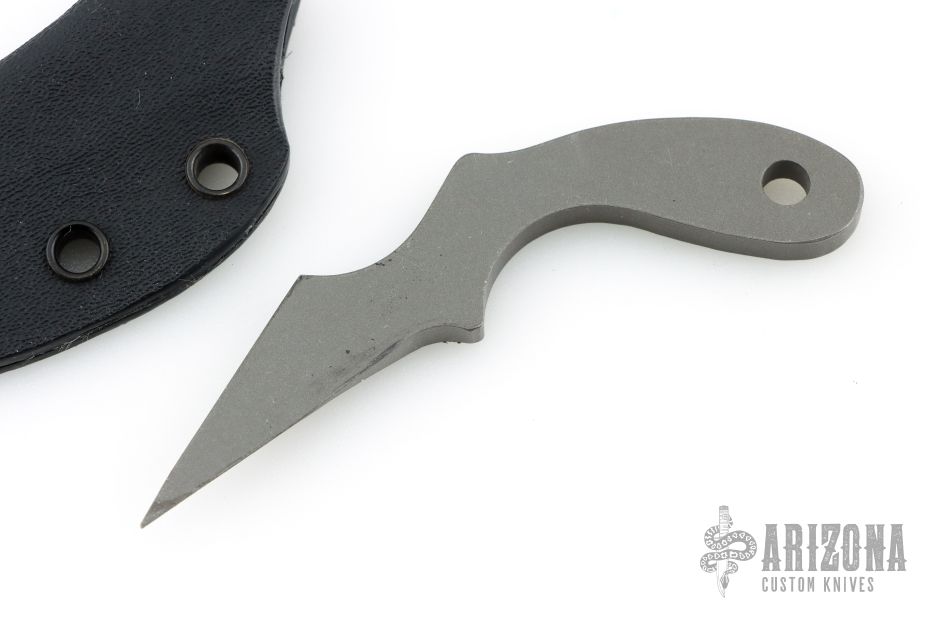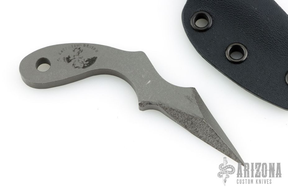This Baby UUK Laci Szabo is made from Titanium, and it has a bead-blast finished, chisel ground blade with a double edge, .240" blade stock and .65" blade depth, integral construction. Includes Kydex neck sheath. New from maker.