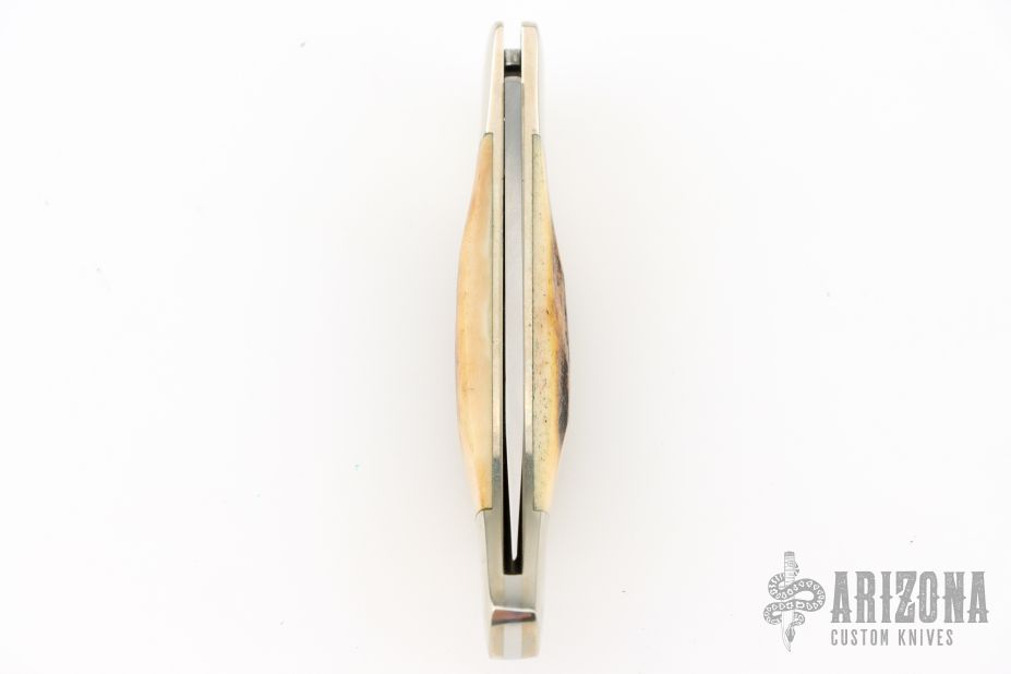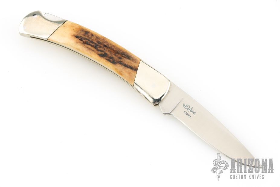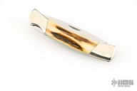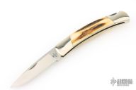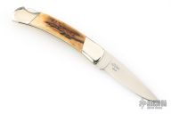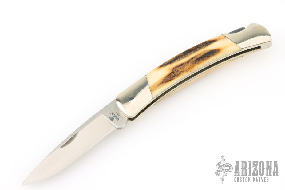 This Buck 501 features a satin finished blade with nail nick. The handle has polished nickel silver bolsters with integral liners, stag inlays and stainless steel spring. Has some light scratches, otherwise excellent condition.