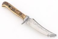 This skinner features a mirror finished upswept blade with false top edge and notched thumbrest, full tang construction, .137" Blade stock, 1.180" Blade Depth.  The handle has an aluminum guard and stag scales with brass rivets. Has scratches, good condition otherwise.
