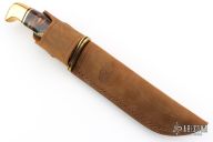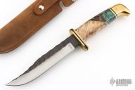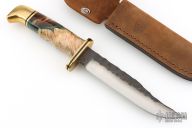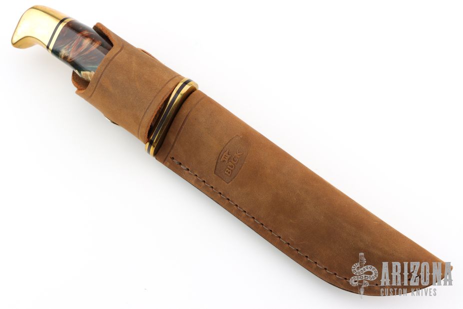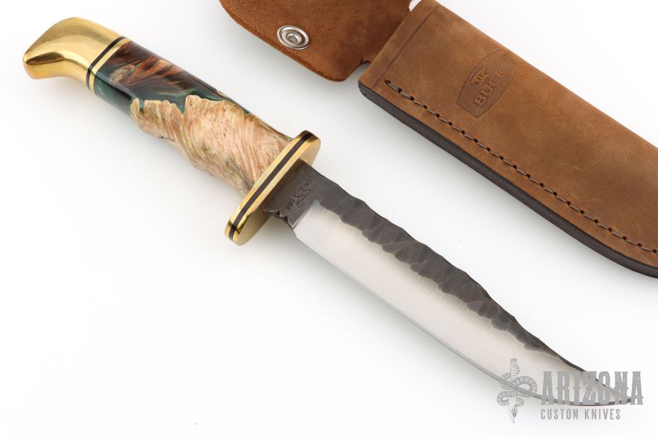 This Model 119 by Buck Knives features a satin finished clip point blade with false top edge and "Flint Knapped" blade, .176" blade stock and 1.048" blade depth, hidden tang construction. The handle has an brass guard and butt, and a maple shokwood grip. Comes with original brown leather sheath, box and papers. Excellent condition.