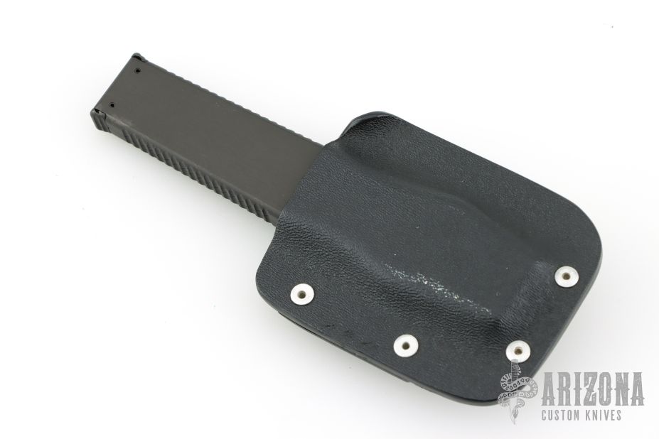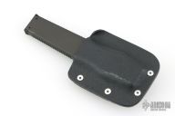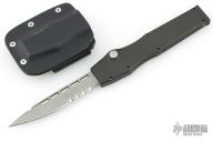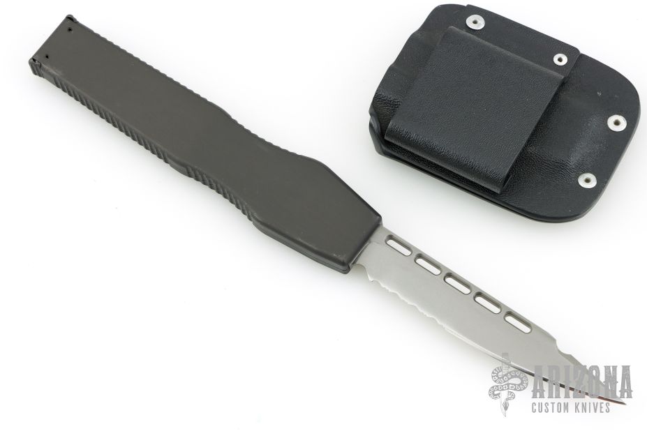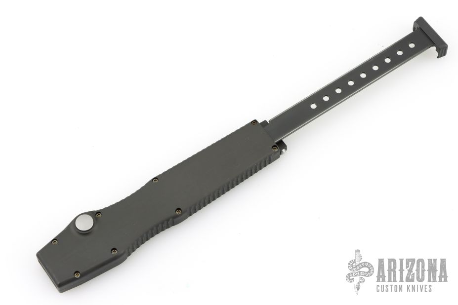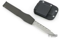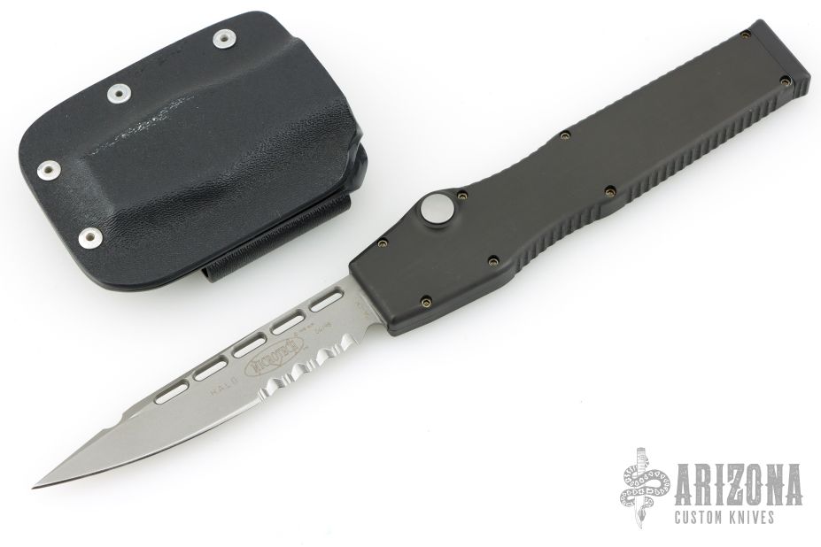 This HALO II is the clip point blade model in the HALO series by Microtech Knives. Single action, side positioned button for firing. Closure via a reverse charging handle in the rear of the frame. Contoured frame grip with milled ribbing on the frame spine and belly. This Halo II has a bead blasted clip point blade. Dated 04/98. Includes a kydex sheath.  Has some light scuffs, otherwise excellent condition.