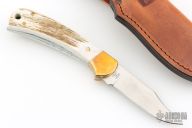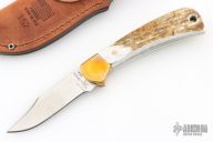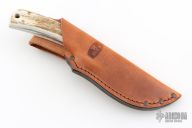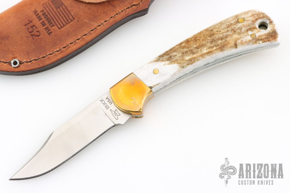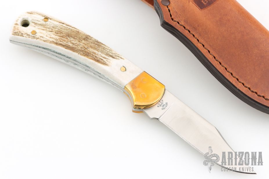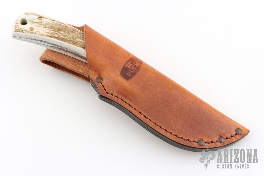 This Model 152 Fixed Ranger by Buck Knives features a satin finished clip point blade with .117" blade stock and .777" blade depth, full tang construction. The handle has brass bolsters, elk antler scales with brass pins and a lanyard hole. Comes with original brown leather sheath and box. Excellent condition.