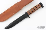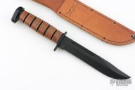The Dog's Head Utility Knife by Ka-Bar, a close relative of the USMC Fighting/Utility knife, presents an alternative to those who wish to have the legendary performance of KA-BAR's military knives in a non-military setting. Ideal for bushcraft, camping, and hunting, the Dog's Head Utility knife is a welcome addition to KA-BAR's robust lineup. Black blade with fullers and false top edge, .172" blade stock and 1.233" blade depth, hidden tang construction. The handle has a black stainless steel guard and butt with stacked leather grip. Comes with original box, papers and brown leather sheath. Excellent condition.