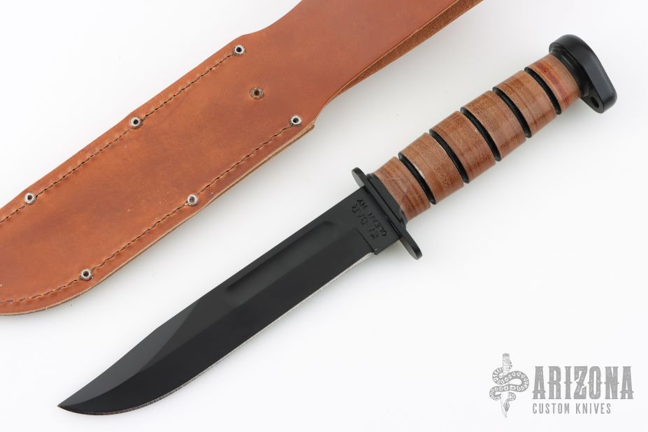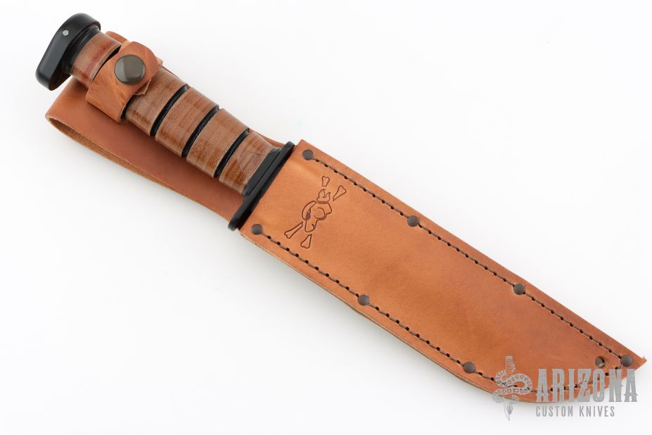 The Dog's Head Utility Knife by Ka-Bar, a close relative of the USMC Fighting/Utility knife, presents an alternative to those who wish to have the legendary performance of KA-BAR's military knives in a non-military setting. Ideal for bushcraft, camping, and hunting, the Dog's Head Utility knife is a welcome addition to KA-BAR's robust lineup. Black blade with fullers and false top edge, .172" blade stock and 1.233" blade depth, hidden tang construction. The handle has a black stainless steel guard and butt with stacked leather grip. Comes with original box, papers and brown leather sheath. Excellent condition.