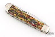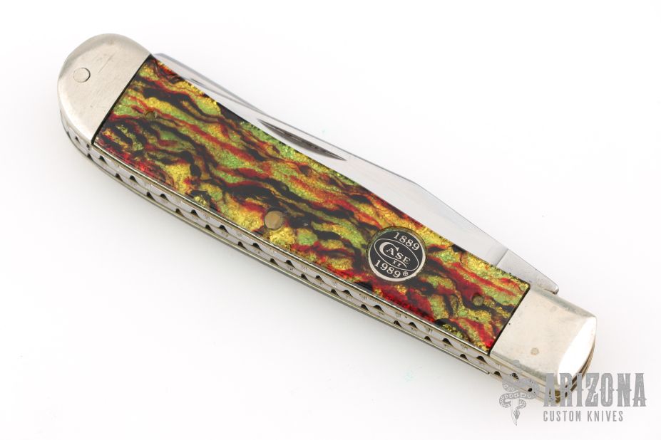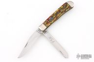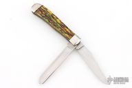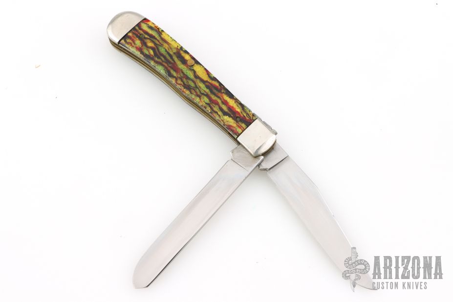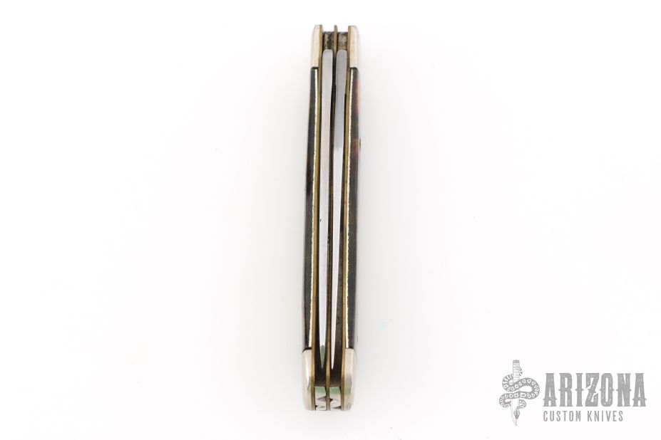 This 2-Blade Trapper by Case Knives features polished blades with nail nicks. The handle has nickel silver bolsters and cap, acrylic covers, brass liners, stainless springs. Has half-stops. Has some light scuffs and scratches, great condition otherwise.