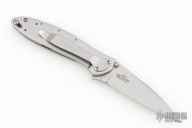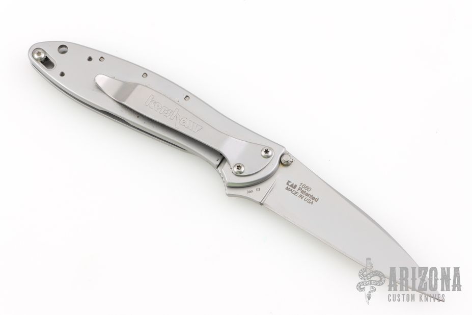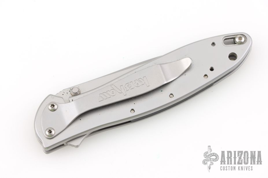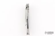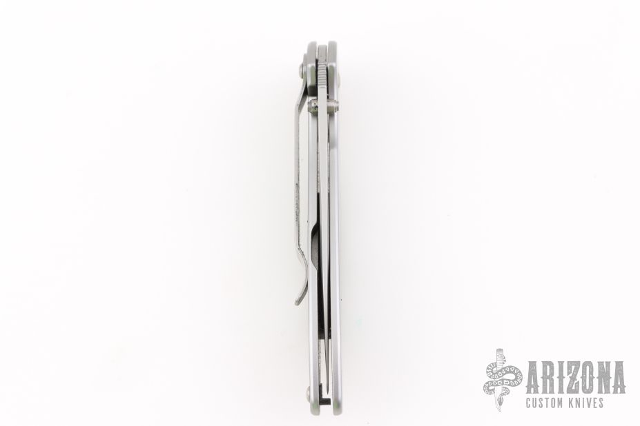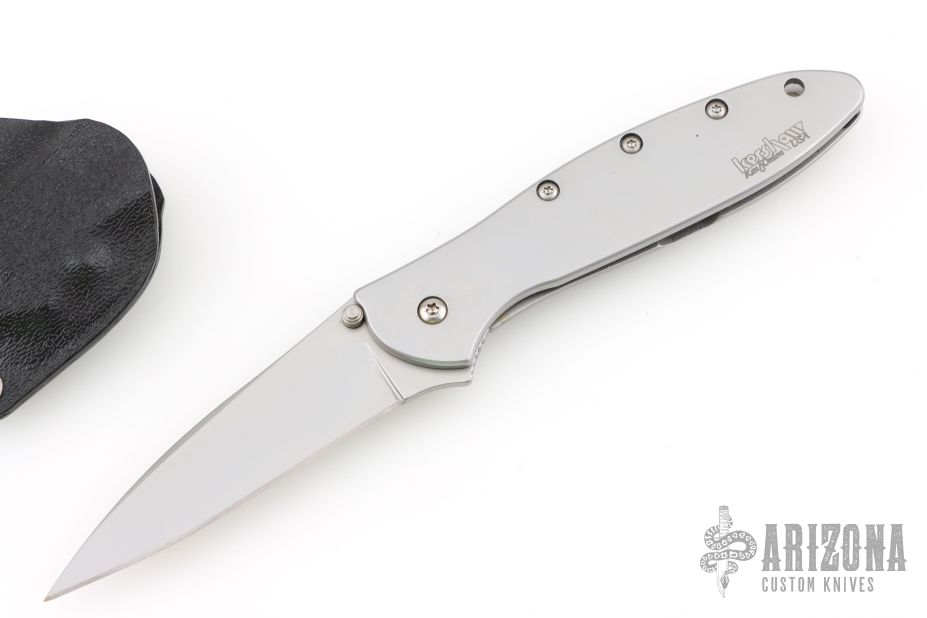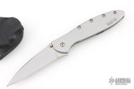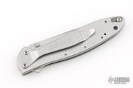 This Leek Assisted Opening Framelock Flipper has a bead blast finished stainless steel drop point blade with dual thumb studs, flipper and notched thumbrest. Handle is bead blast finished stainless steel frame, with lanyard hole and safety lock. Stainless steel clip is tip up/ down reversible, RH carry. Comes with a Kydex neck sheath. Has some light scuffs and scratches, great overall condition.