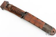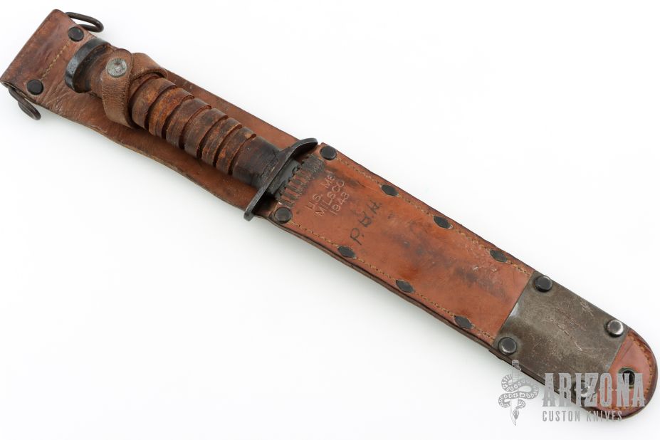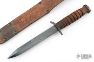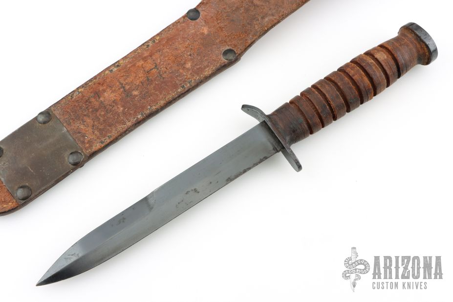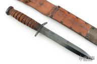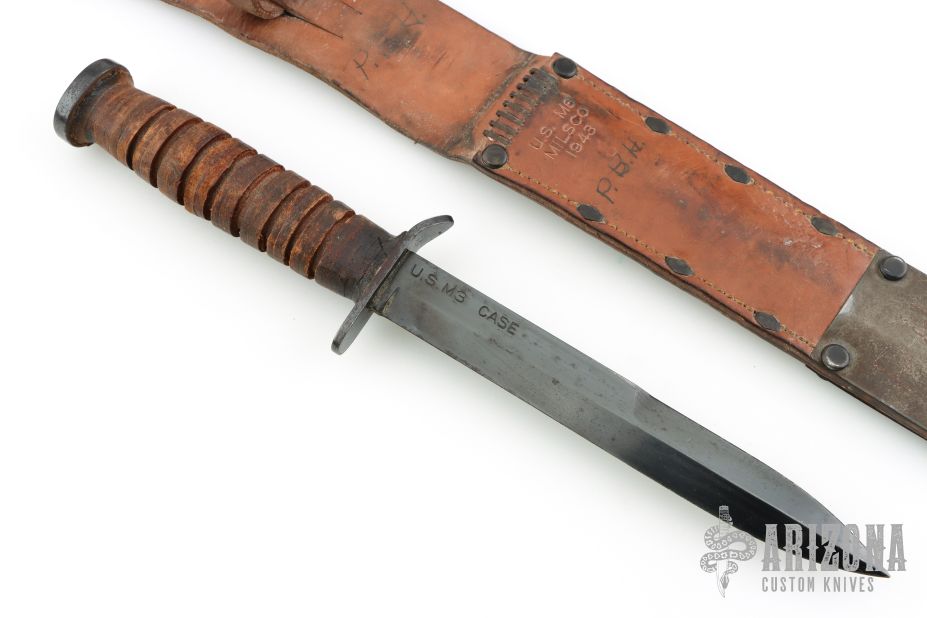 This M3 from Case Knives features a black bayonet ground blade with sharpened top edge, .174" blade stock and .889" blade depth, hidden tang construction. The handle has a black steel guard and butt, and a stacked leather grip. Comes with a brown leather scabbard with belt loop marked "U.S. M6 MILSCO 1943". Has some light oxidation spots, otherwise good condition for its age.