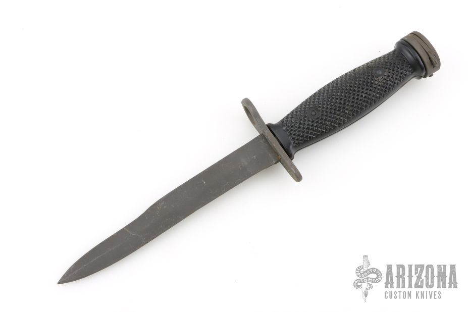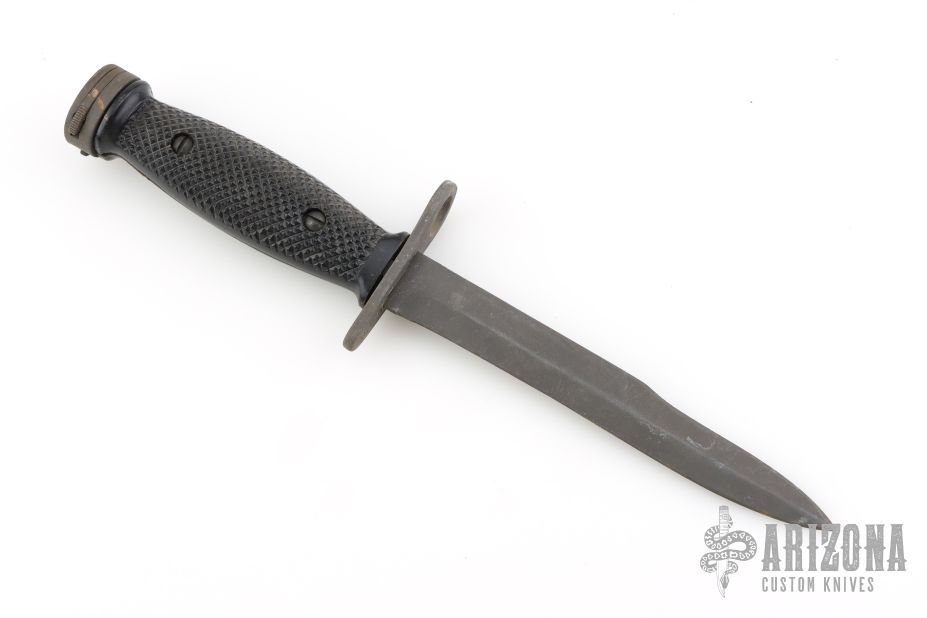 This M8A1 has a black bayonet style blade with sharpened top edge, .198" blade stock and .857" blade depth, hidden tang construction. The handle has a black steel guard and checkered handle. Has scuffs and scratches, good condition for its age. Has been resharpened. This is for an M16 rifle.