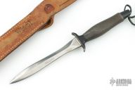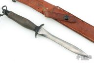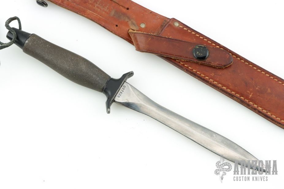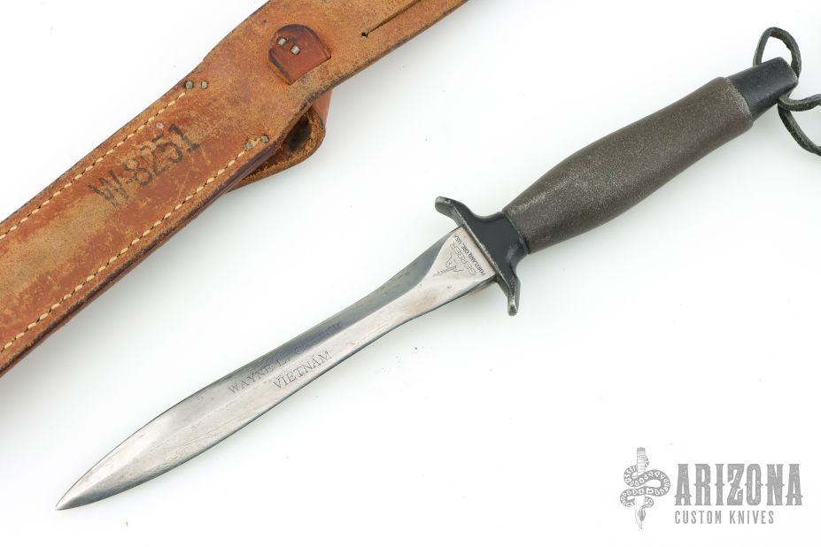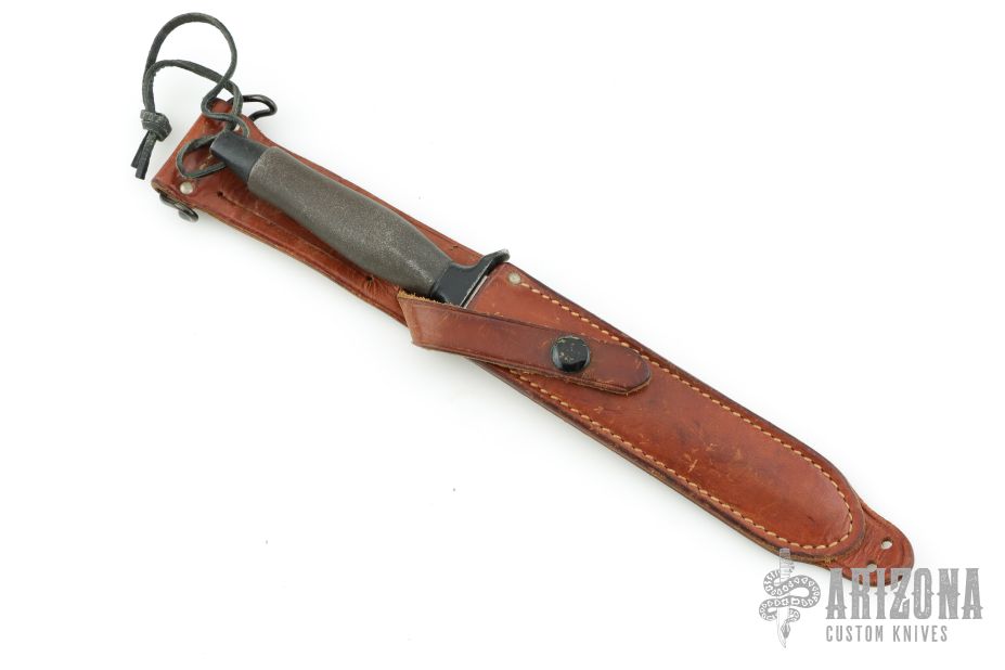 The Mark II is one of the best selling knives of all time. First introduced in 1966, this tactical knife is serialized for collectors. This one has a satin finished hand ground double edged blade, .239" blade stock and .953" blade depth, hidden tang construction with a black/grey aluminum handle. This knife is Serial #007628 and was made in 1968. Comes with original brown leather sheath. Has some scratches and light pitting, otherwise good condition for its age. Has "Wayne L Cooper Vietnam" on the blade.