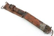 This one has a spear point blade with sharpened top edge, .180" blade stock and .871" blade depth, hidden tang construction. The handle has a black steel guard and butt with a stacked leather grip. Comes with original brown leather sheath that is stamped "U.S. M6 MOOSE CO 1943" Has some scratches and patina, otherwise good condition for its age.