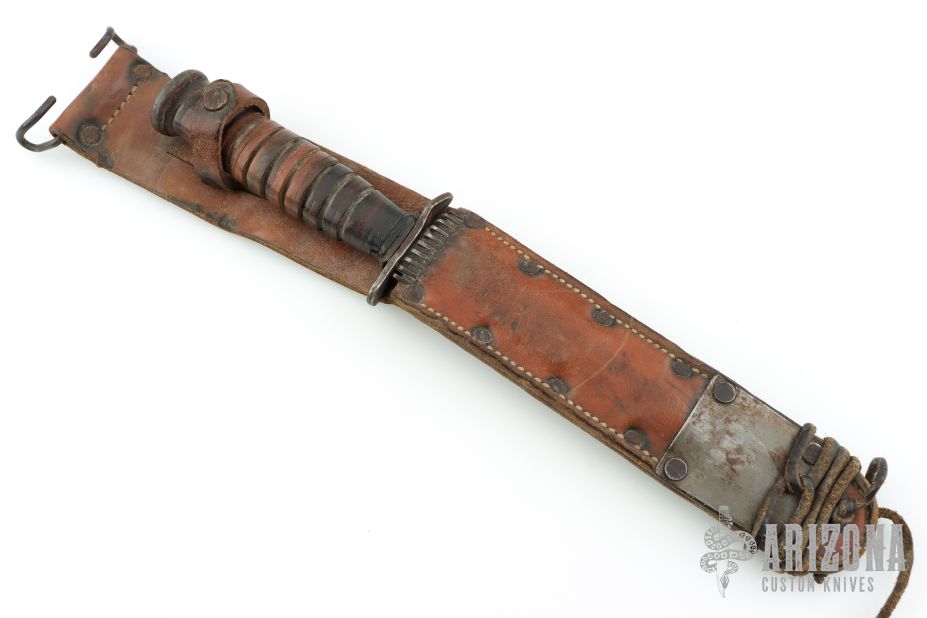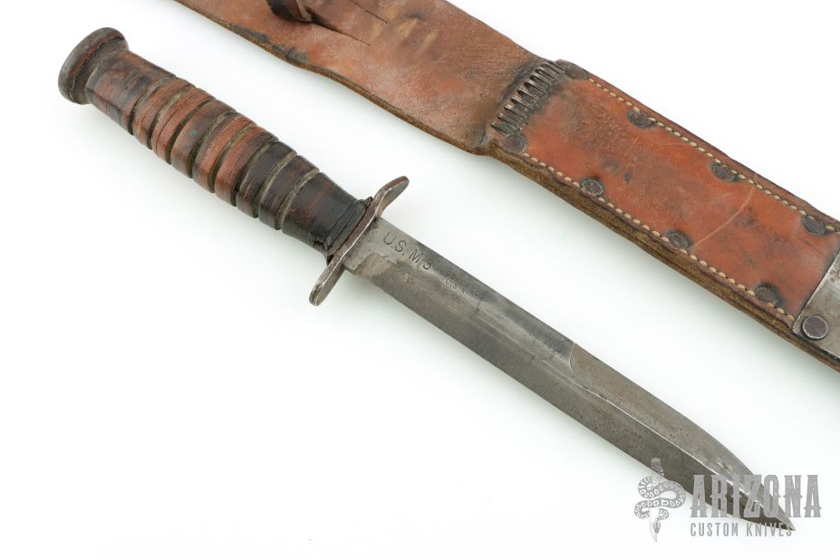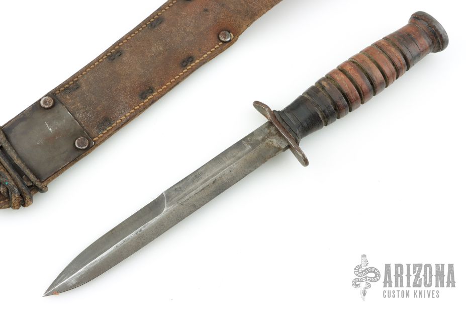 This one has a spear point blade with sharpened top edge, .180" blade stock and .871" blade depth, hidden tang construction. The handle has a black steel guard and butt with a stacked leather grip. Comes with original brown leather sheath that is stamped "U.S. M6 MOOSE CO 1943" Has some scratches and patina, otherwise good condition for its age.