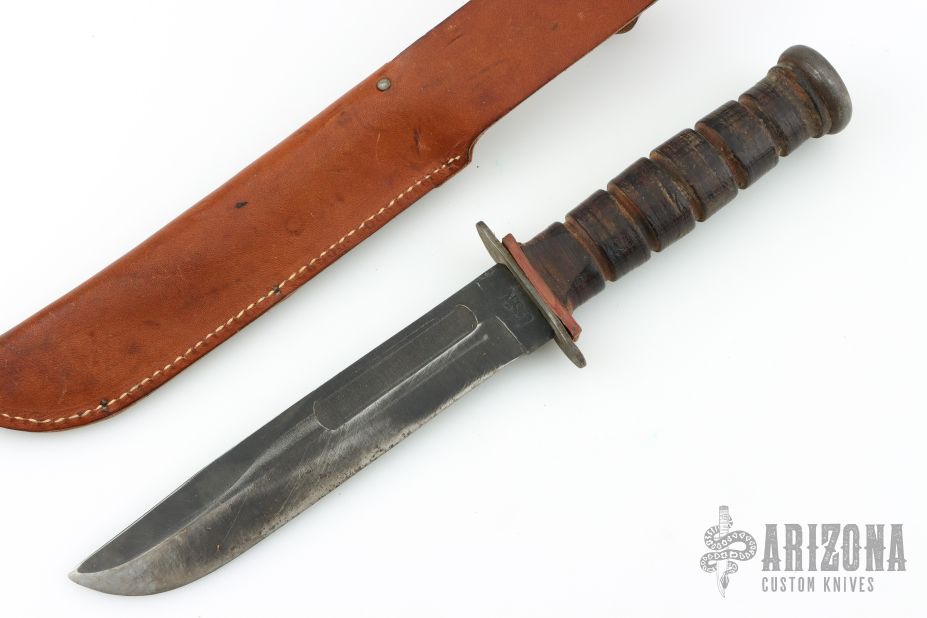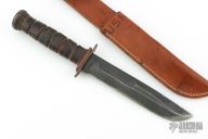 This World War II era USN MK2 Field Knife from Robeson Cutlery Company features a clip point blade with sharpened top edge and fullers. The handle has a steel guard, stacked leather handle and steel pommel over hidden tang construction. Includes a brown leather sheath marked "USN". Has some scratches and light oxidation, has been resharpened, otherwise good condition for its age.