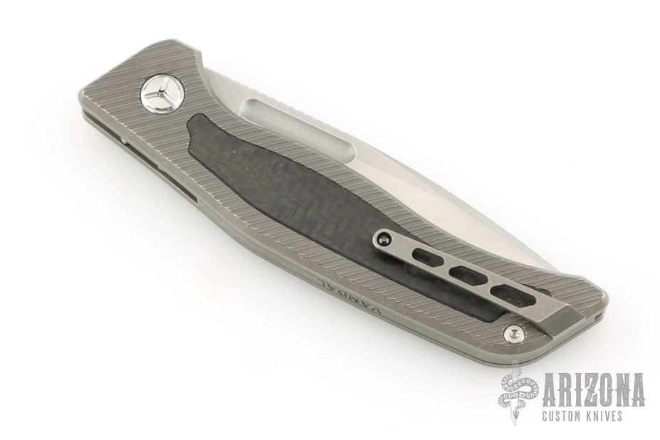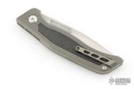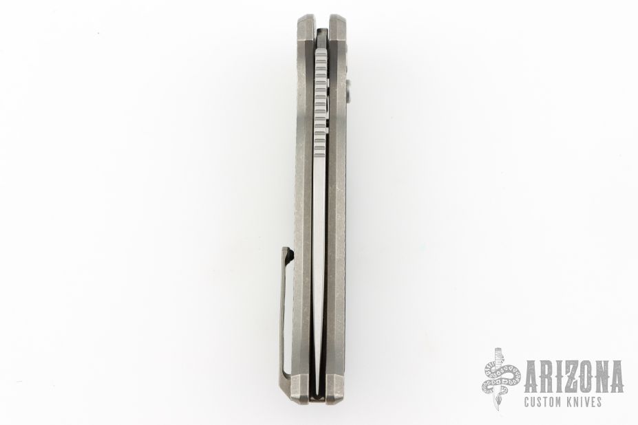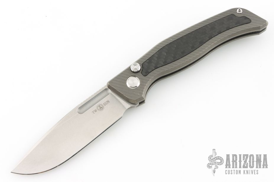 This TS329 by TwoSun Knives features a tumble finished blade with notched thumbrest and fullers. The handle has a tumbled titanium frame with carbon fiber inlays, tip up titanium clip and backspacer. Has some light scuffs, otherwise excellent condition.