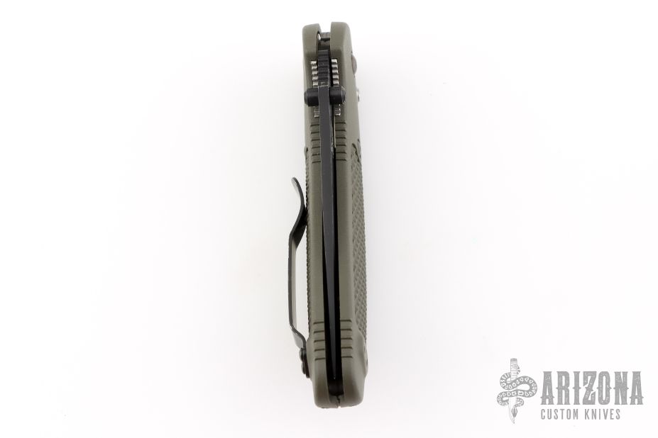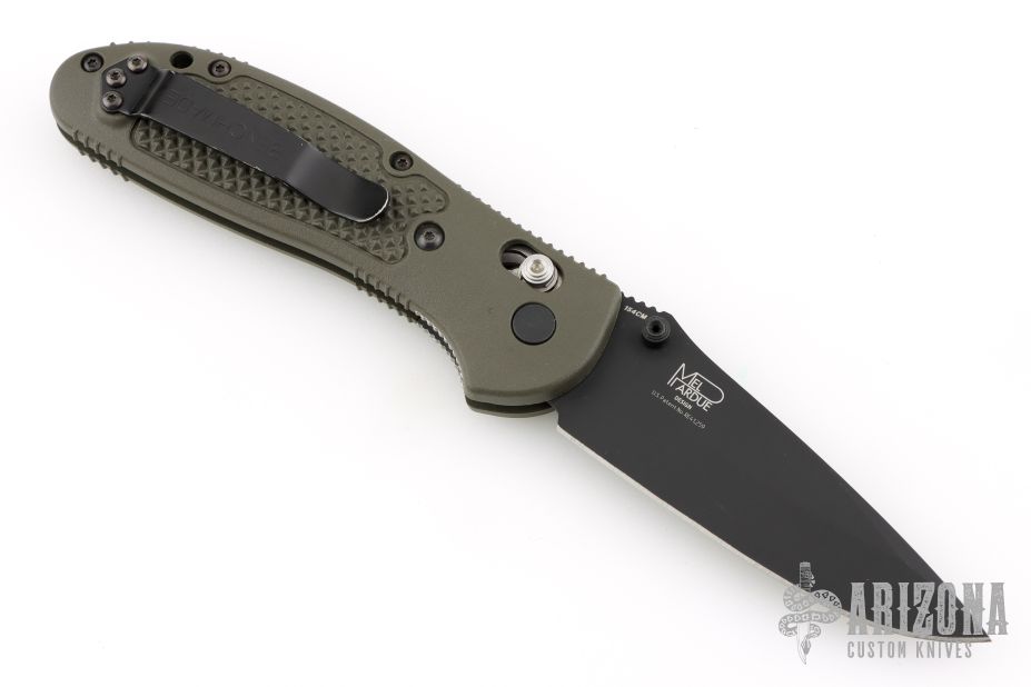 This Griptilian by Benchmade features a black blade with swedge, notched thumbrest and dual thumbstuds. The handle has textured FRN scales with a black stainless tip up pocket clip. The pocket clip can be reversed for right or left tip up carry. The AXIS lock system makes the knife easy to open and easy to close. Comes with a Benchmade nylon sheath. Has a few light scuffs, otherwise excellent condition.