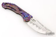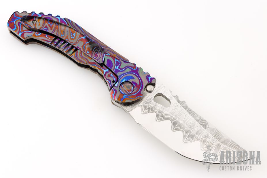 This Sole-Authorship Integral framelock folder from Dalibor Bergam features a polished Sole-Authorship San Mai Damascus blade with thumb hole and notched thumbrest. The handle has a sole-authorship black timascus frame with a matching tip up clip. Nice detent, blade seating and lock up. Comes with leather pouch. Excellent condition.