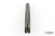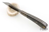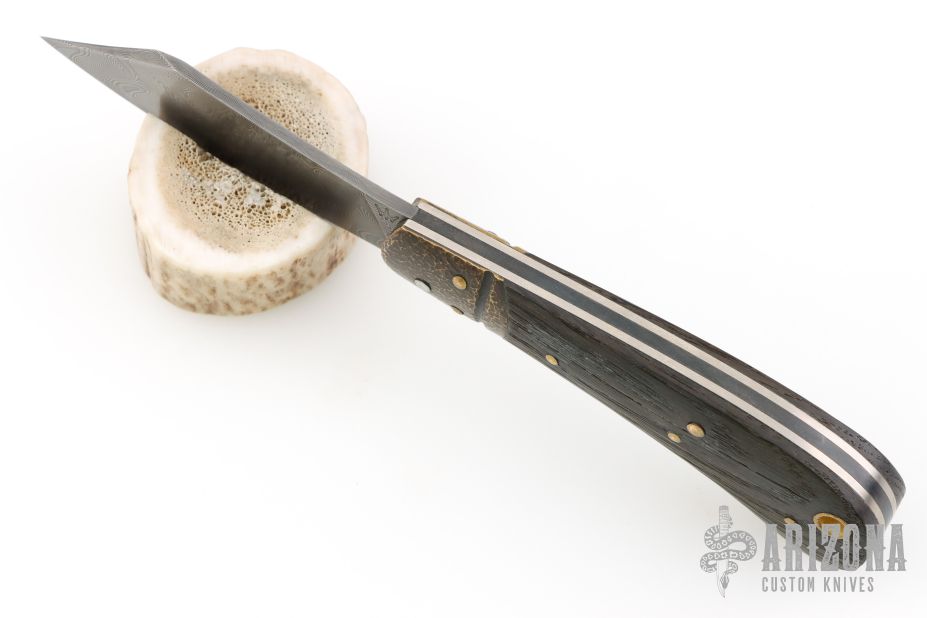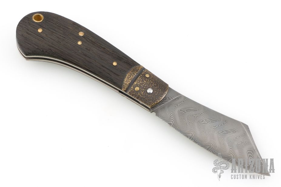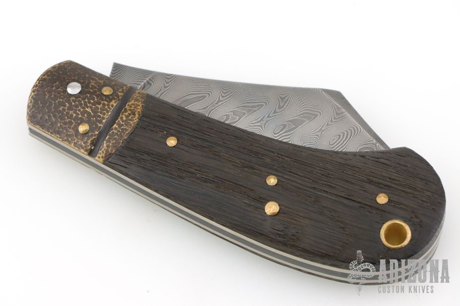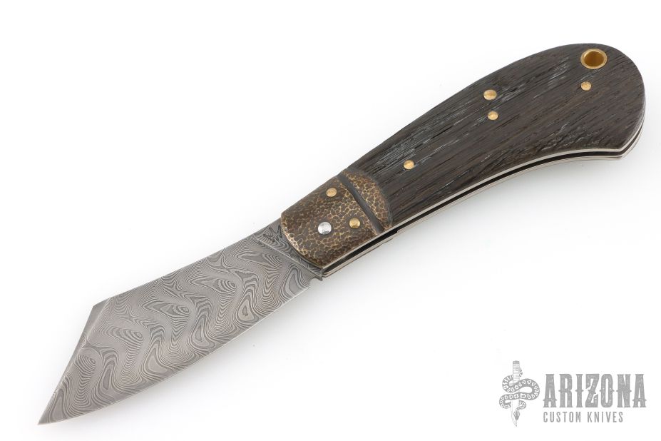 This slipjoint by Nicolas Weber features a Damascus blade. The handle has dovetailed, hammered and fluted brass bolsters, Morta Wood (bog oak) covers, hand peened brass pins and lanyard hole, satin titanium liners, blued steel spring. Has half-stop, flush in all positions. Excellent condition. Comes with a leather slip sheath.