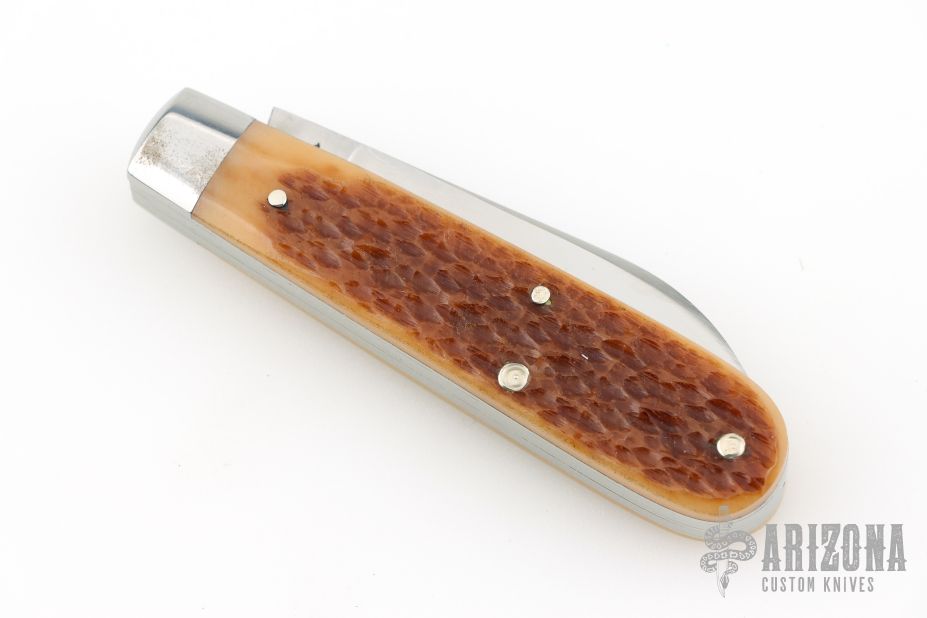 This slipjoint by Schatt and Morgan features two satin finished blade with nail nicks. The handle features nickel silver bolsters, steel liners and bone covers. Steel springs. Comes with original box. Excellent condition.