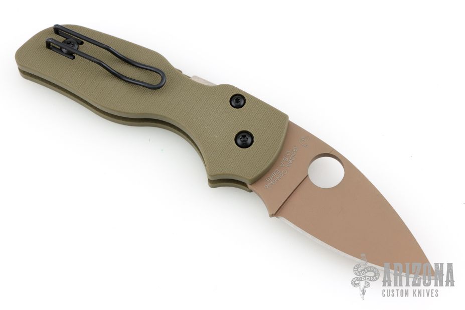 This Lil' Native by Spyderco features a FDE finished blade with thumbhole. The handle has green G-10 scales with stainless steel liners and clip, tip up reversible. Comes with original box and papers. New condition.