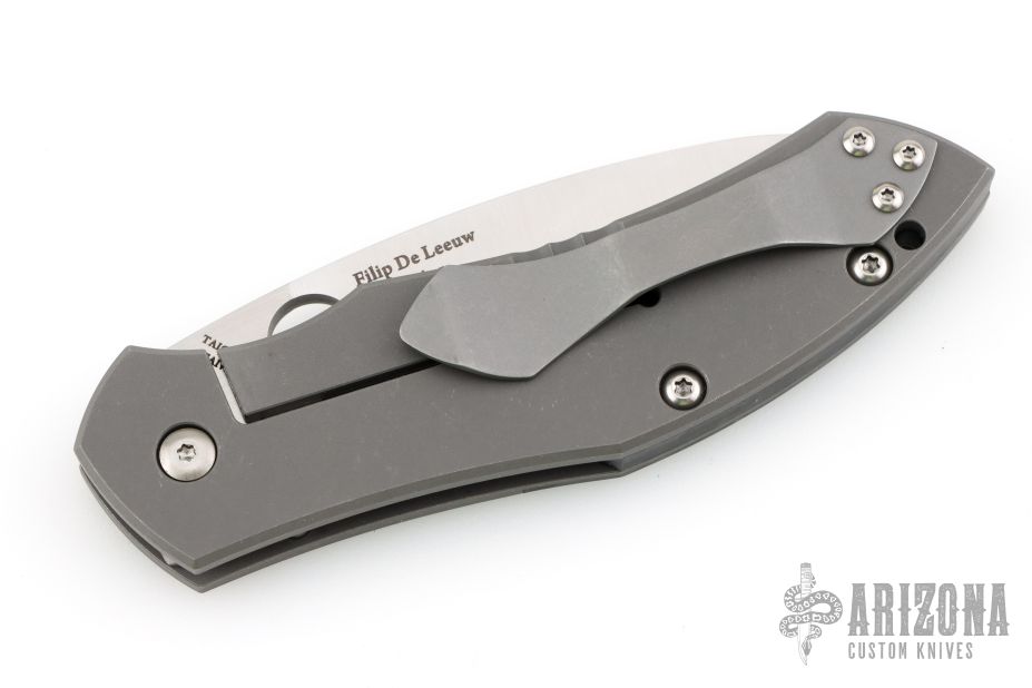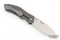 This Myrtle Pln by Spyderco is a Filip De Leeuw Design. It features a satin finished recurve hawkbill blade with thumbhole opening. The handle has an acid tumbled titanium frame and bolster with shard carbon fiber scale and black G-10 backspacer, tip up acid tumbled stainless steel clip and a lanyard hole at the butt. Comes with original box and papers. Nice detent, lockup and blade seating. New condition.
