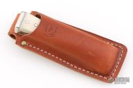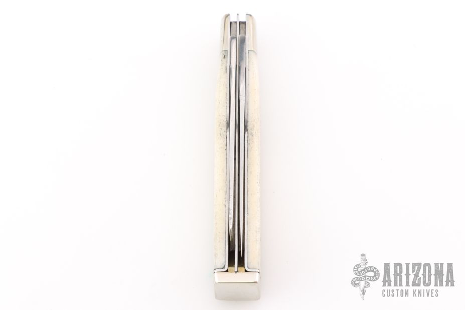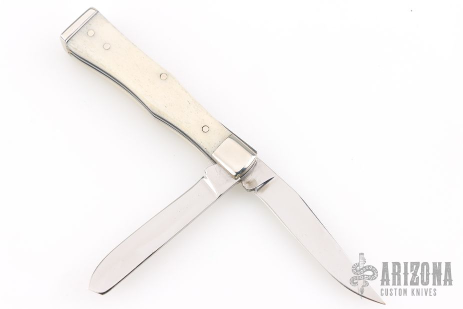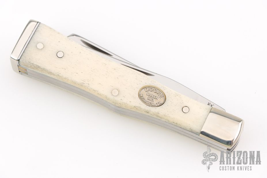 This two blade trapper by Moore Maker features mirror finished blades with nail nicks. The handle has nickel silver bolsters, escutcheon, bone scales, steel liners, stainless steel spring. Comes with original leather sheath. Has some light scratches, otherwise excellent condition.