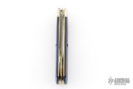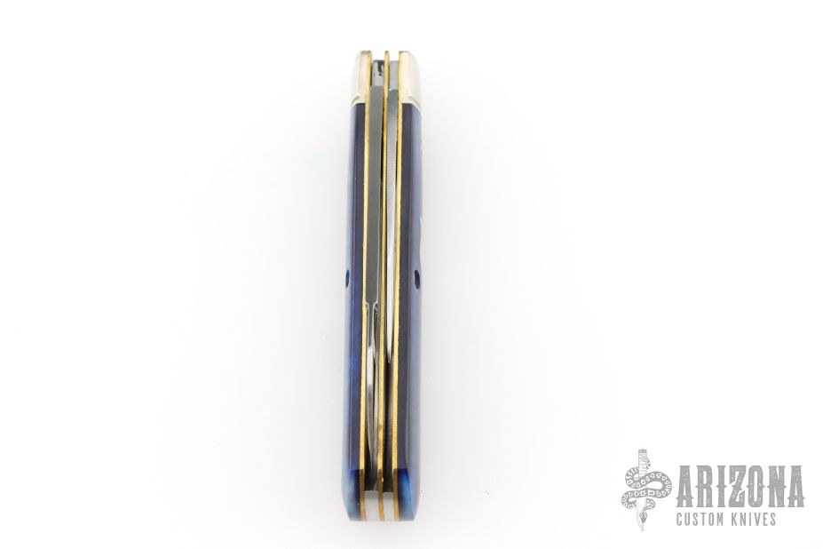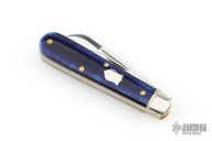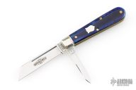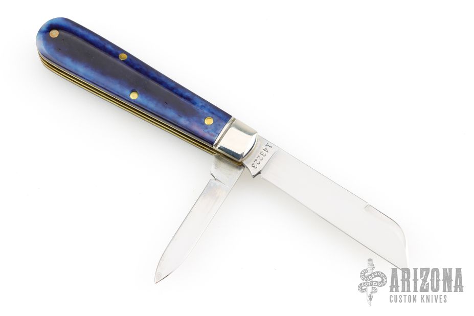 This knife features two satin finished blade both with single nail nicks. The handle has nickle silver bolsters, with navy blue smooth bone and brass liners. Comes with original packaging. Excellent condition.