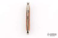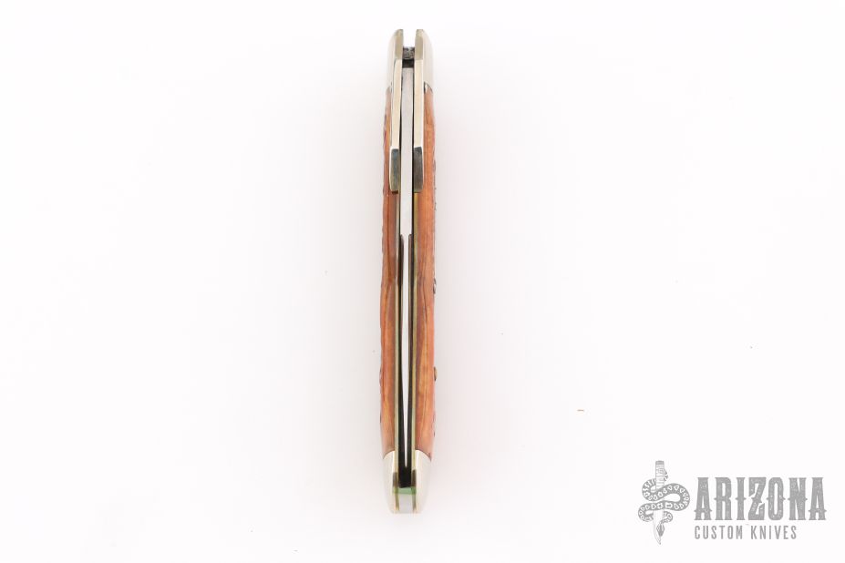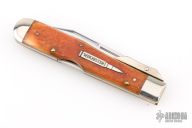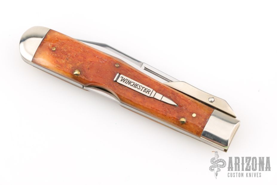 This lock back folder from Winchester features a clip point mirror polished blade with nail nick. The handle has nickel silver bolsters, front and rear, and swing guard, and the scales are burnt orange jigged bone over brass liners and stainless rocker bar. Comes with original box and papers. Has some light scratches, excellent condition otherwise.