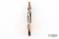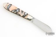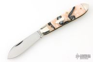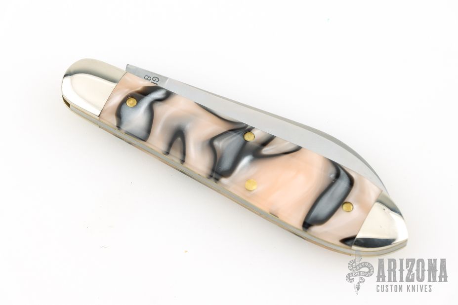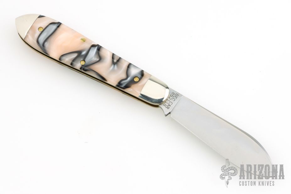 This slipjoint by Great Eastern Cutlery features a satin finished blade with nail nick. The handle has nickel silver bolsters and brass liners, pink synthetic covers. Comes with original tube and wax paper. Excellent condition.