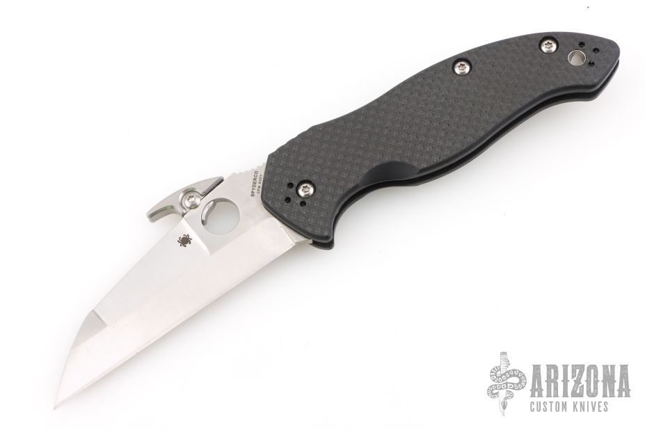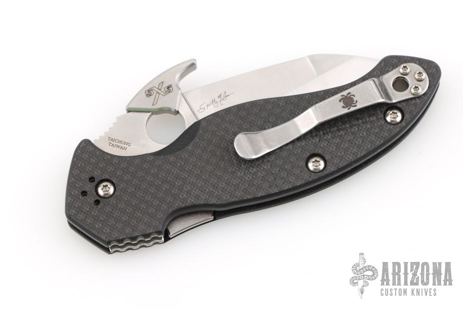 The Canis from Spyderco is a spectacle of a knife designed for everyday carry. The blade is made of CPM-S30V, and features a truly unique blade profile and grind. It has a Wharncliffe shape, a flat grind, and a ground out section which reduces weight, but full spine thickness near the tip to reinforce it. The handle is made of a carbon fiber/G-10 laminate with a gentle texture to hold it nicely in the hand.