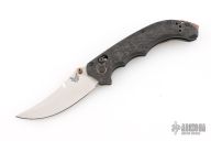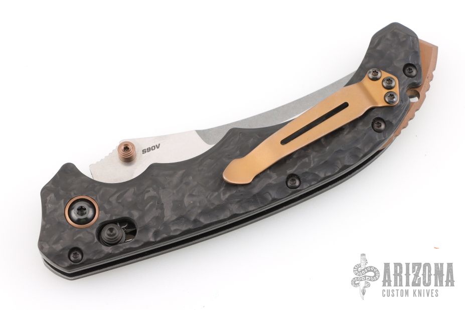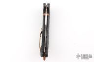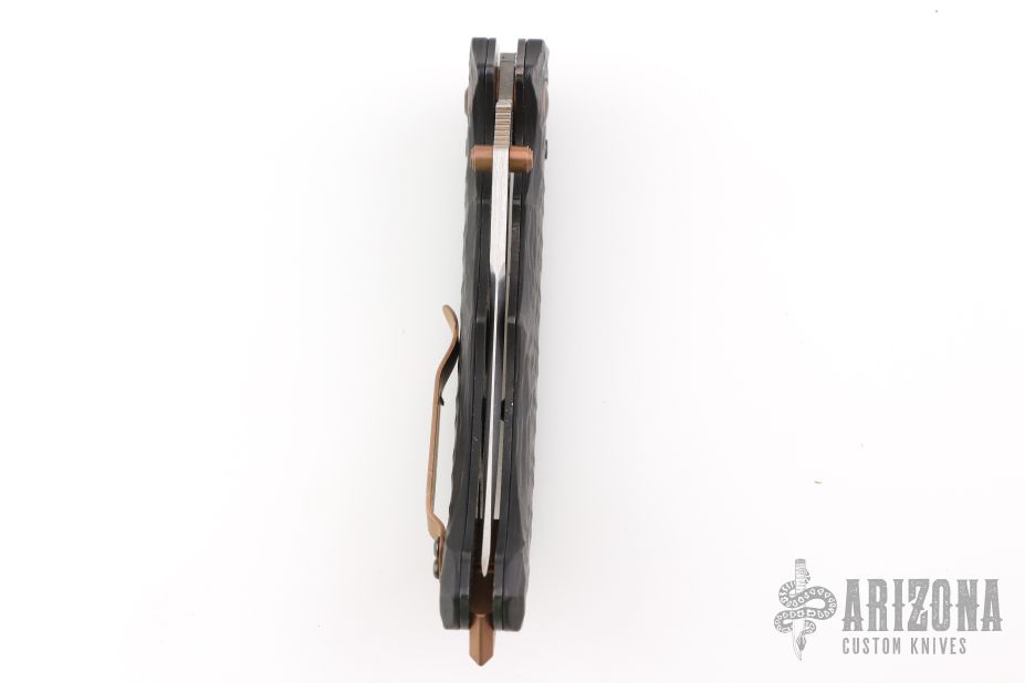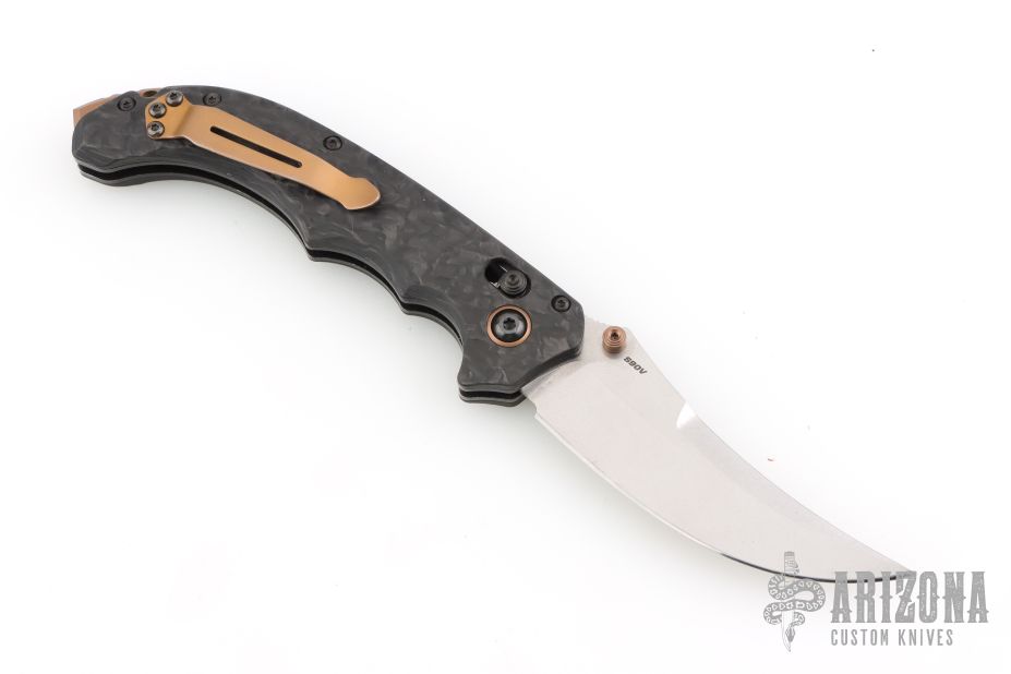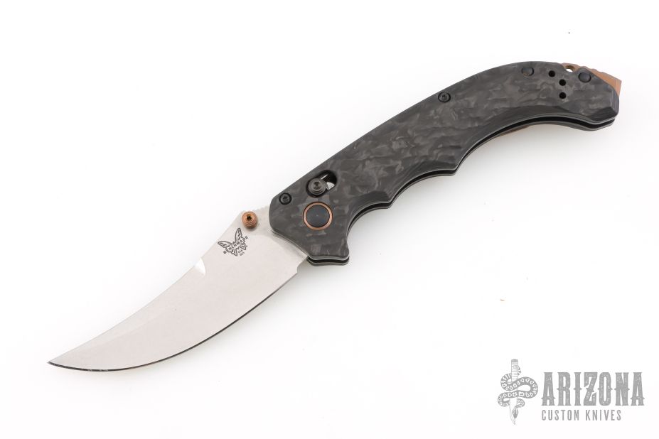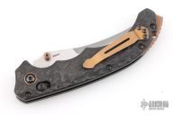 This 865SBK Mini Bedlam from Benchmade features a tumble finished trailing point blade with swedge, dual thumb studs and notched thumb rest. The handle is comprised of marble carbon fiber scales over black coated steel liners and bronze coated steel backspacer with lanyard hole and glass breaker. Bronze coated tip up pocket clip can be mounted for right or left hand carry. Comes with original box, pouch and papers. Has a few light scuffs, excellent condition otherwise.