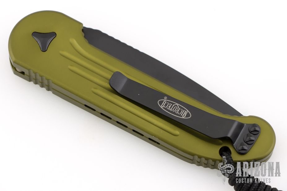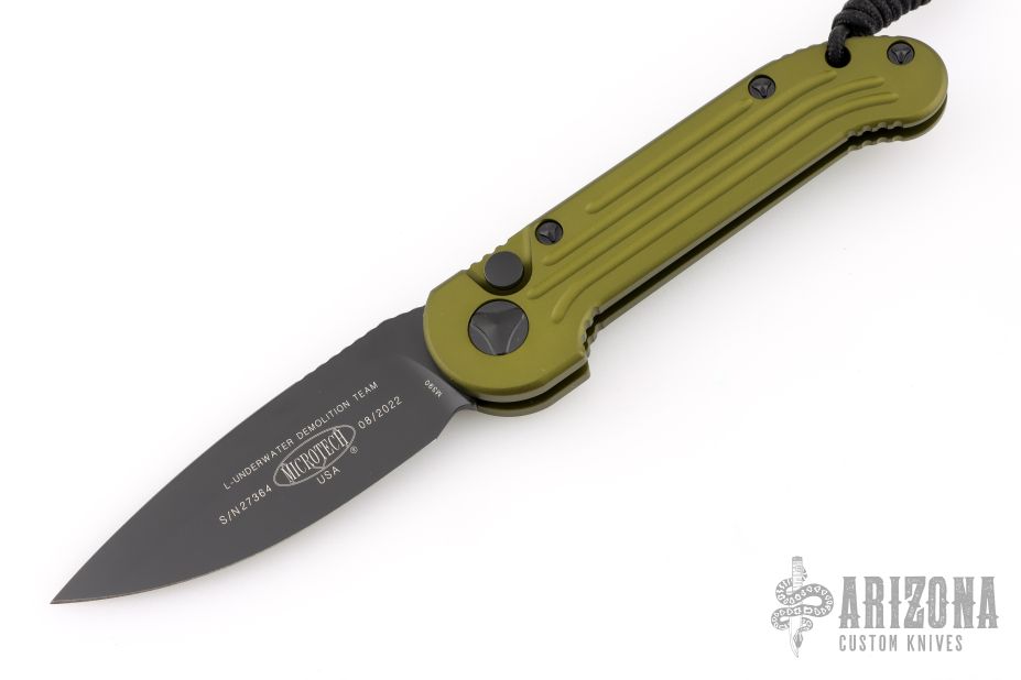 This LUDT side opening automatic by Microtech has a black blade with a standard edge and a green aluminum frame. Stainless steel clip. Dated 08/2022 and serial number 27364. Comes with original box and papers. Excellent condition.