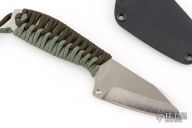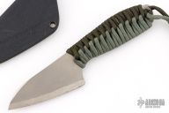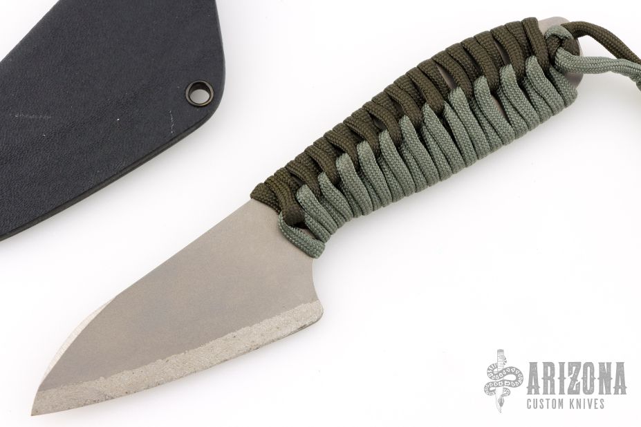 This knife by Jeff Halopoff features a two tone titanium chisel ground blade with satin grinds and bead blasted flats, .092" blade stock and 1.47" blade depth, full hidden tang. The handle is wrapped with black and green paracord. Comes with a kydex sheath. Excellent condition. Blade Steel: Titanium w/ Carbide Edge