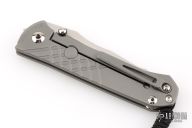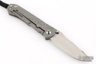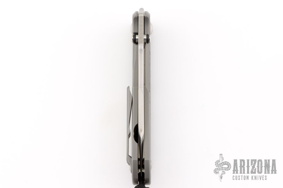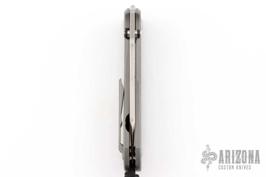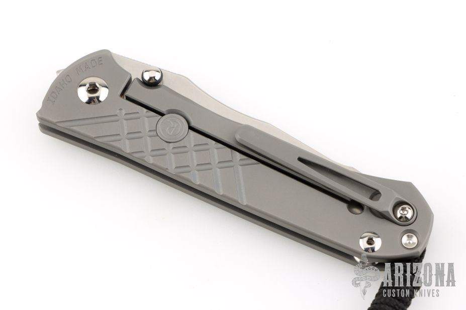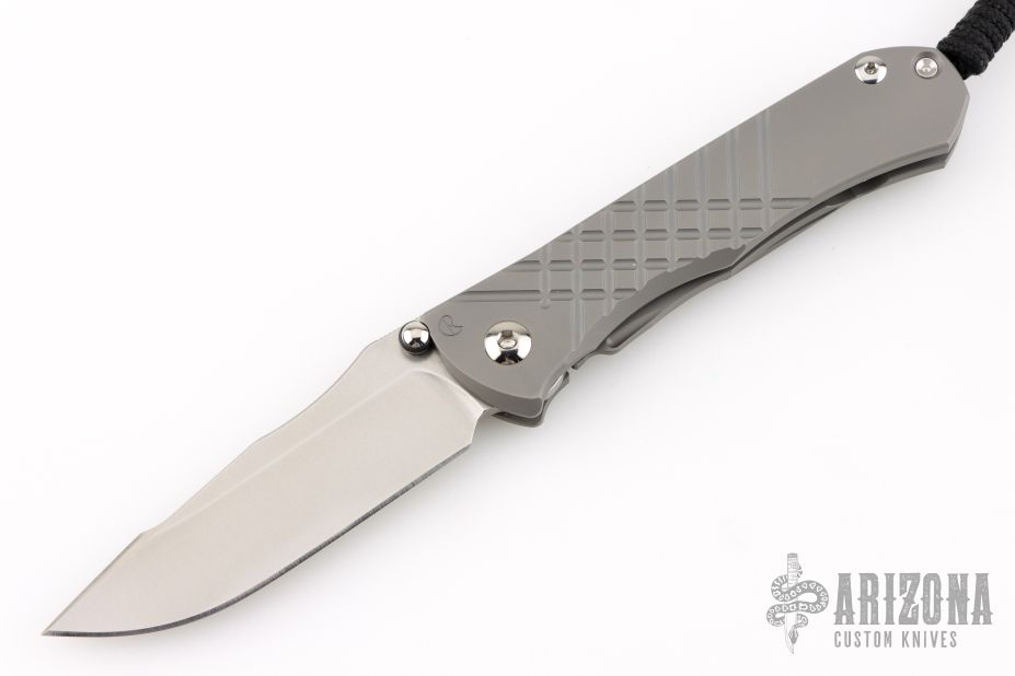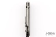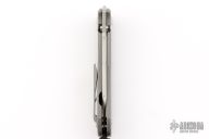 This Unumzaan from Chris Reeve Knives features a stonewash finished blade with dual thumb studs and notched thumbrest. The handle is comprised of glass blasted and milled titanium with matching tip up clip. Lanyard pin with lanyard and spacer bead in pommel. Comes with CRK leather slip sheath. Marked inside the slabs B-24. Excellent condition.