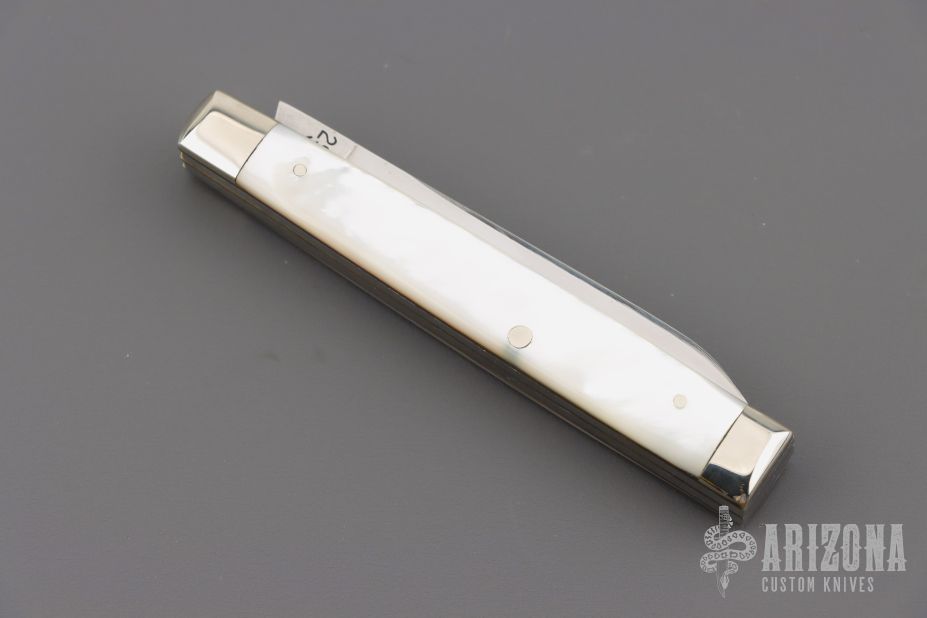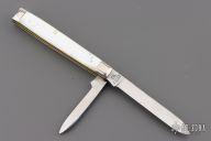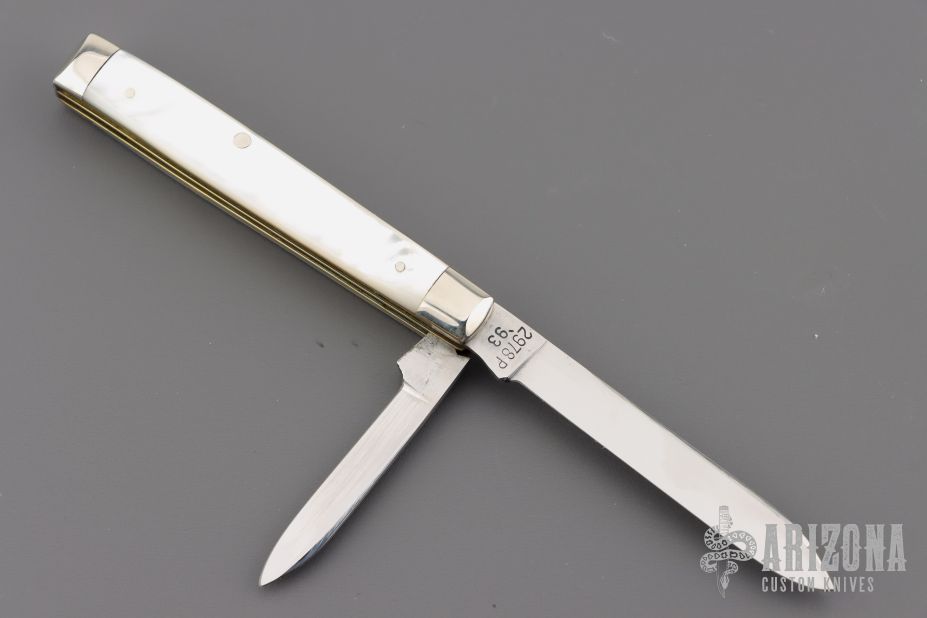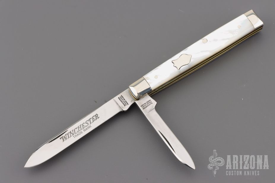 This Winchester folder features two mirror polished blades. Nickel Silver front and rear bolsters with pearl covers. Brass liners and steel springs. Original box. Has some light scratches, Excellent condition.