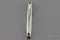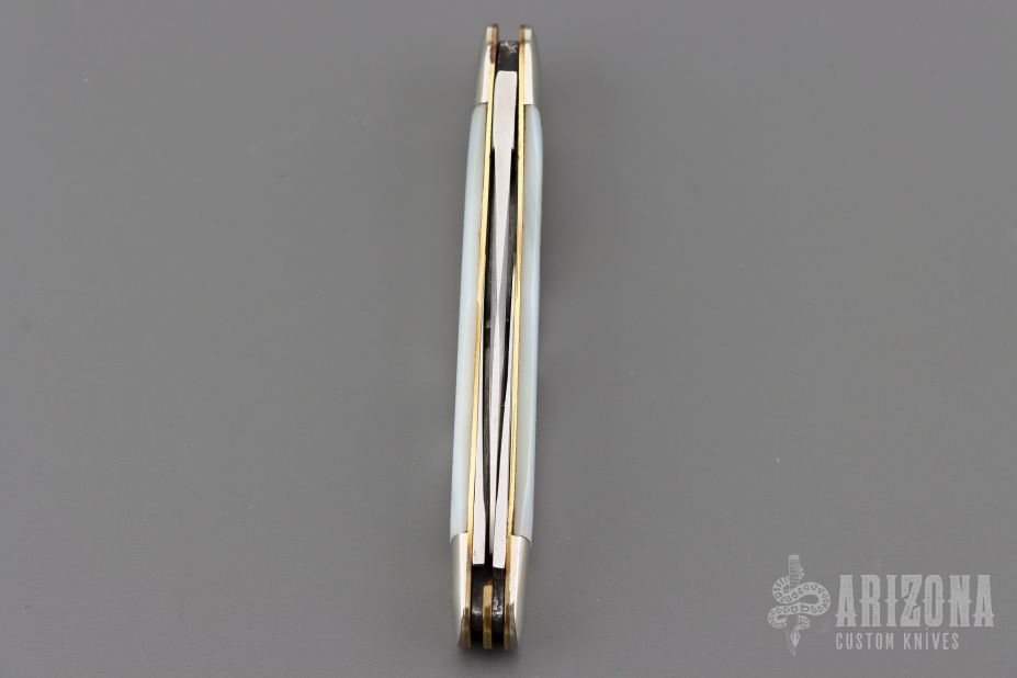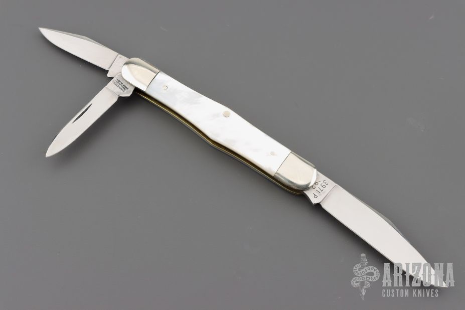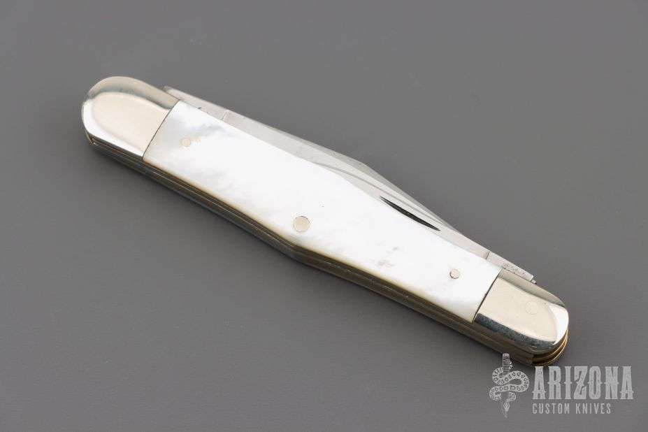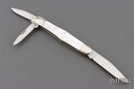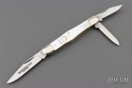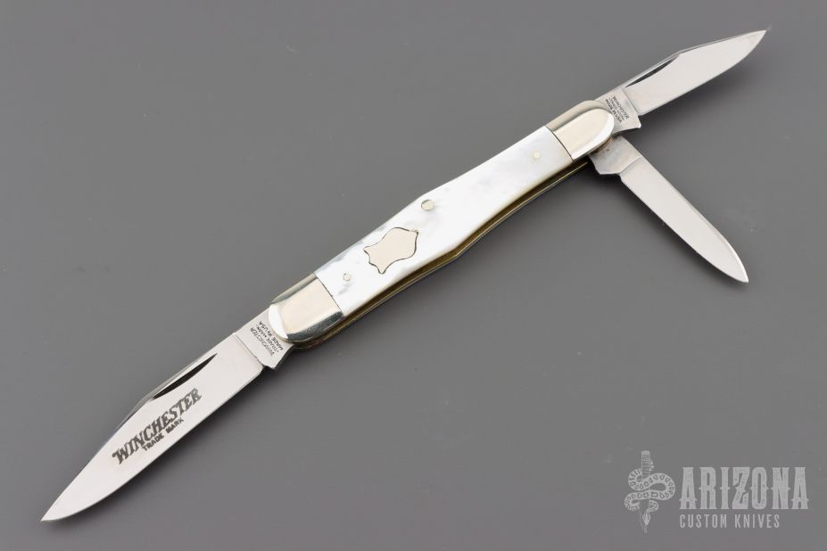This Winchester folder features three mirror polished blades. Nickel Silver front and rear bolsters with pearl covers. Split-back brass liners and steel springs. Original box. Has some light scratches, Excellent condition.