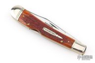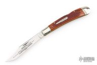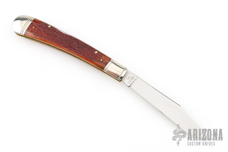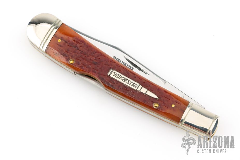 This Winchester knife has a mirror polished blade with nail nick. The handle has nickel silver bolsters, jigged bone covers, nickel silver escutcheon, brass liners, stainless steel backspacer. Comes with original box and papers. Has some light scratches, excellent condition.