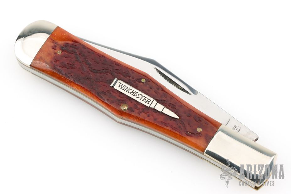 This Winchester folder features a mirror polished blade. Nickel Silver front and rear bolsters with very nice jigged bone covers. Brass liners and steel springs. Includes original box and papers. Has a couple light scratches, otherwise Excellent Condition.