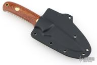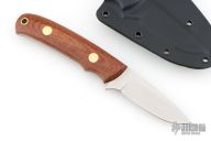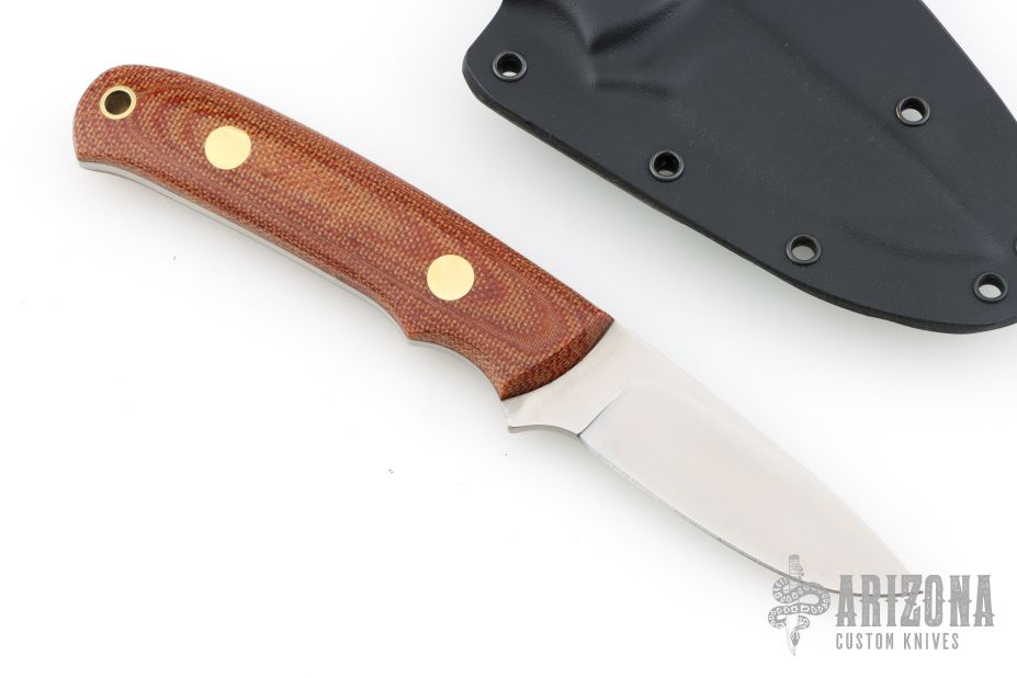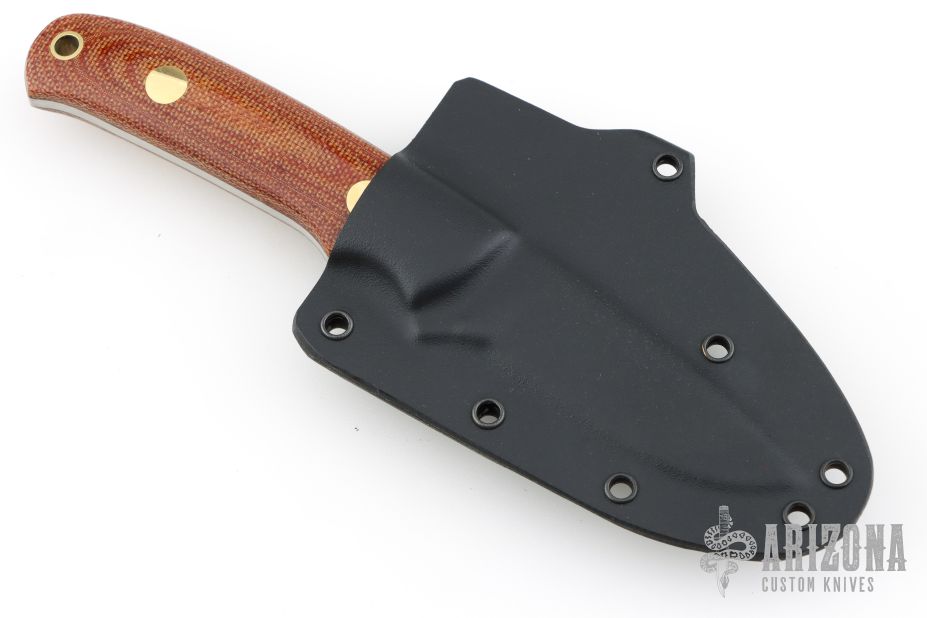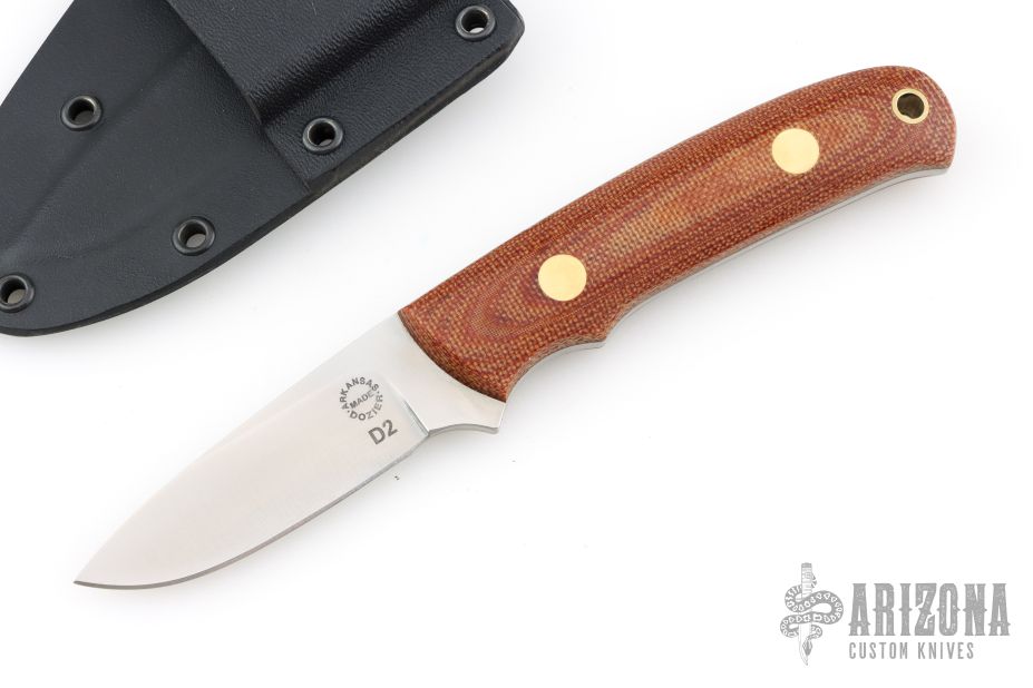 This K-14 by Dozier knives has a satin finished drop point blade with full tang construction. .126" blade depth and .860" blade stock. Has natural micarta scales with brass pins and lanyard hole. Comes with a kydex sheath. Excellent condition.