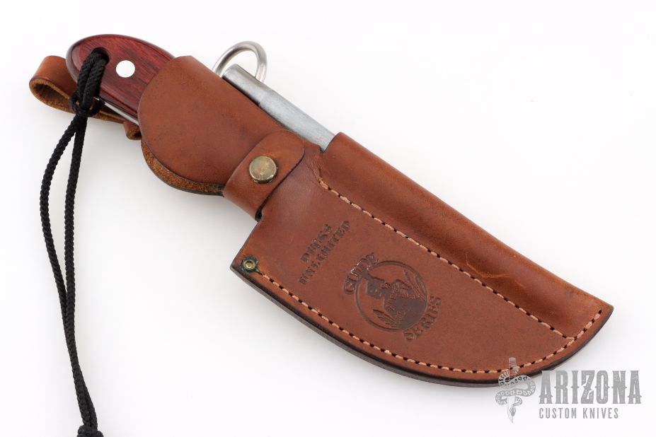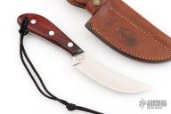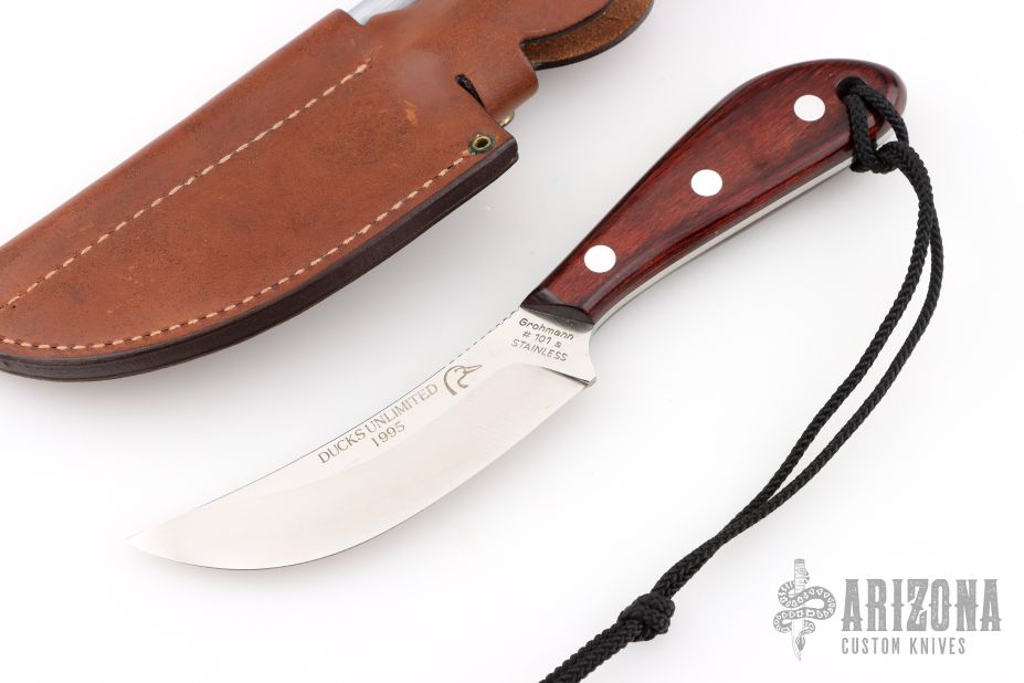 The skinner, by Grohmann Knives features a satin finished trailing point blade with a notched thumbrest and full tang construction. .115" Blade Stock .990" Blade Depth. The handle is composed of pinned laminated wood scales. Includes original brown leather sheath with sharpening steel. Has a few light scratches, otherwise excellent condition.
