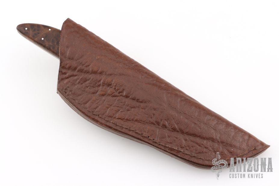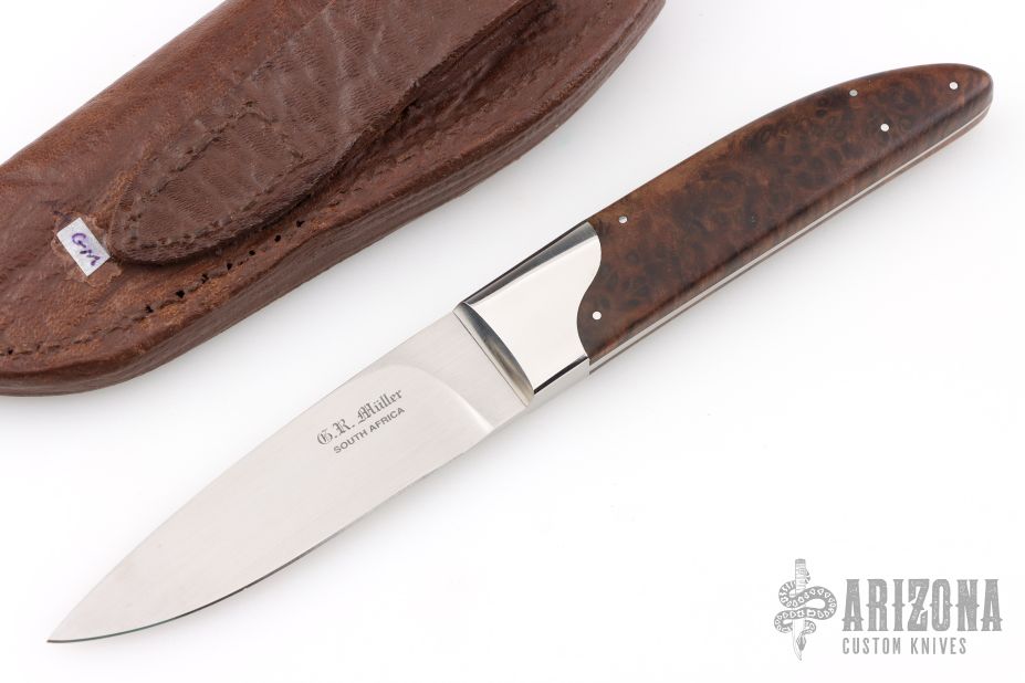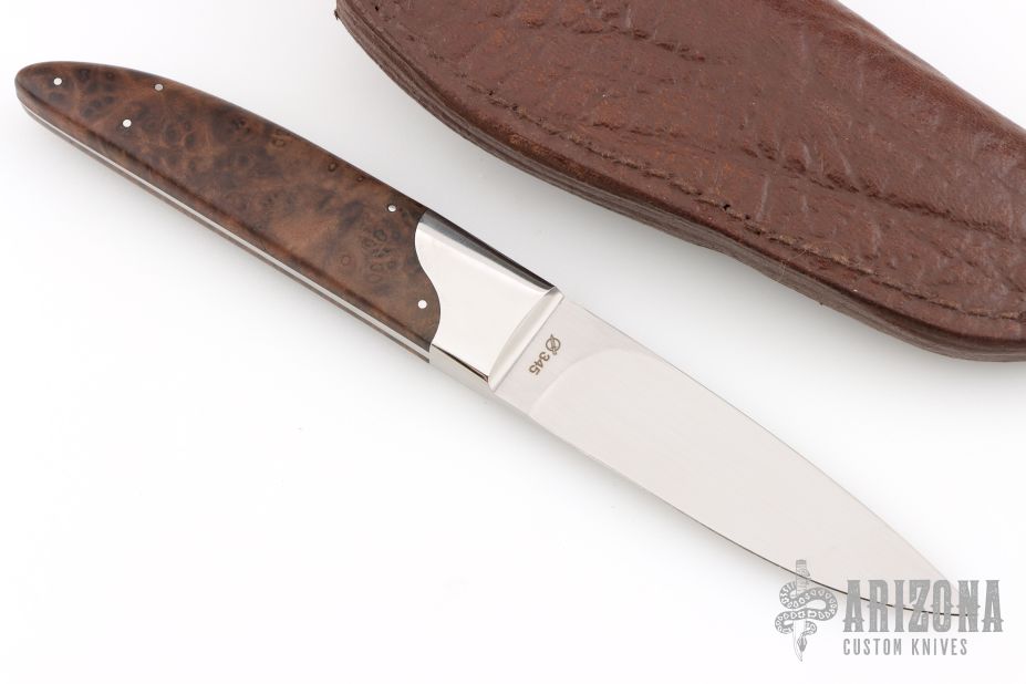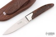 This Utility by Gunther Muller features a hand rub satin finished drop point blade with .117" blade stock and .914" blade depth, full tapered tang construction. The handle has polished 303 stainless steel bolsters, Claro Walnut scales with stainless steel pins. Comes with a brown leather sheath. Excellent condition. #345