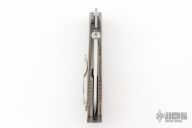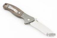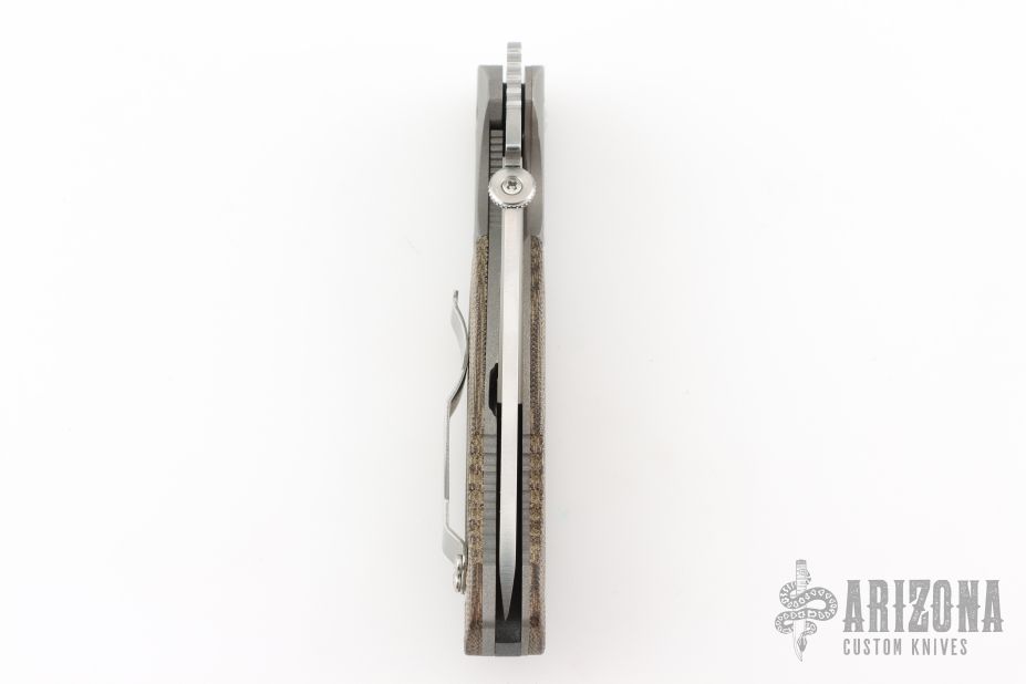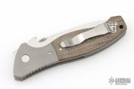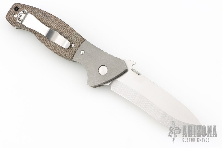 This custom CQC-11 by Emerson Knives features a hand-ground satin finish blade, bead blast titanium dovetailed bolsters and liners, green canvas micarta scales, black G-10 backspacer, tip up stainless steel clip. Notched thumbrest. Wave feature and thumbdisc. Nice blade seating, lockup and detent. Has a couple light scuffs, otherwise excellent condition.