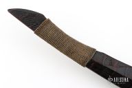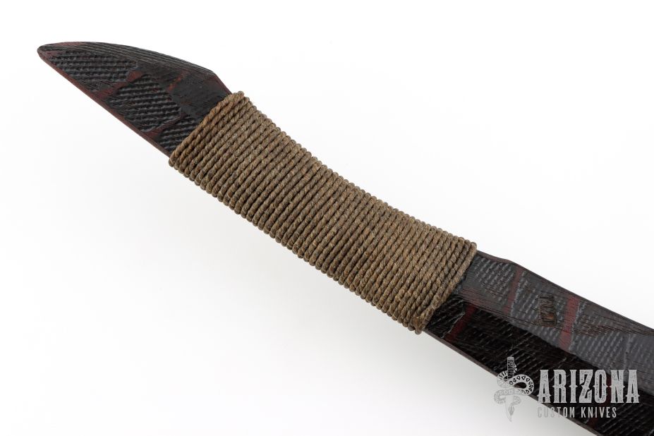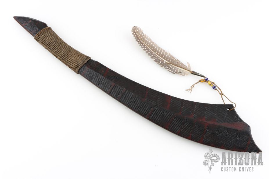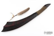 Straight from Ryan's shop is his take on the Red Stick war club! Inspired by the Creek warriors. Ryan took the theme and ran with it! His Red Stick Club is constructed from straight-grained hard wood with fire brands down the length of it. The main body features a long sweeping profile with a cord-wrapped handle and features a feather and ornate beads. These Red Stick War Club Saps are not for the faint of heart!