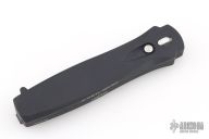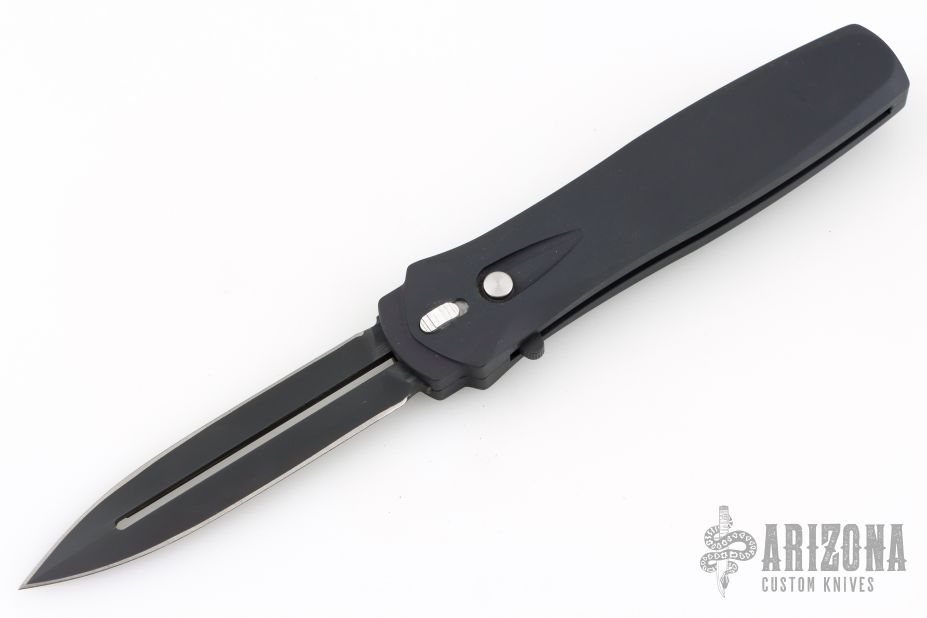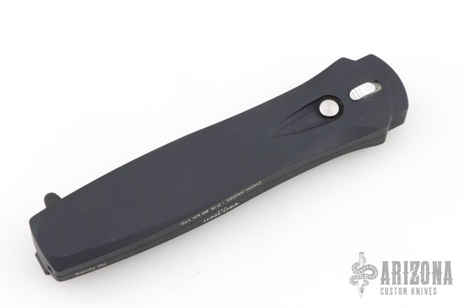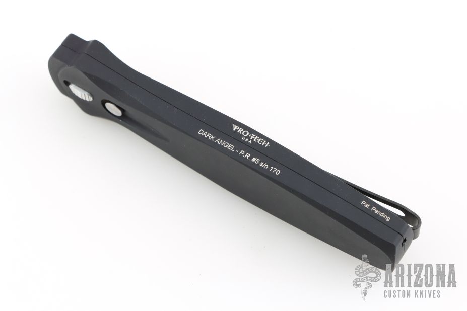 This is a Dark Angel single action out the front auto by Pro-Tech Knives features a black finished double edged blade and black anodized aluminum handle. Safety switch. Production run #5 s/n 170. Comes in a Bestech zipper case. Has a couple light scuffs and scratches, excellent condition otherwise.