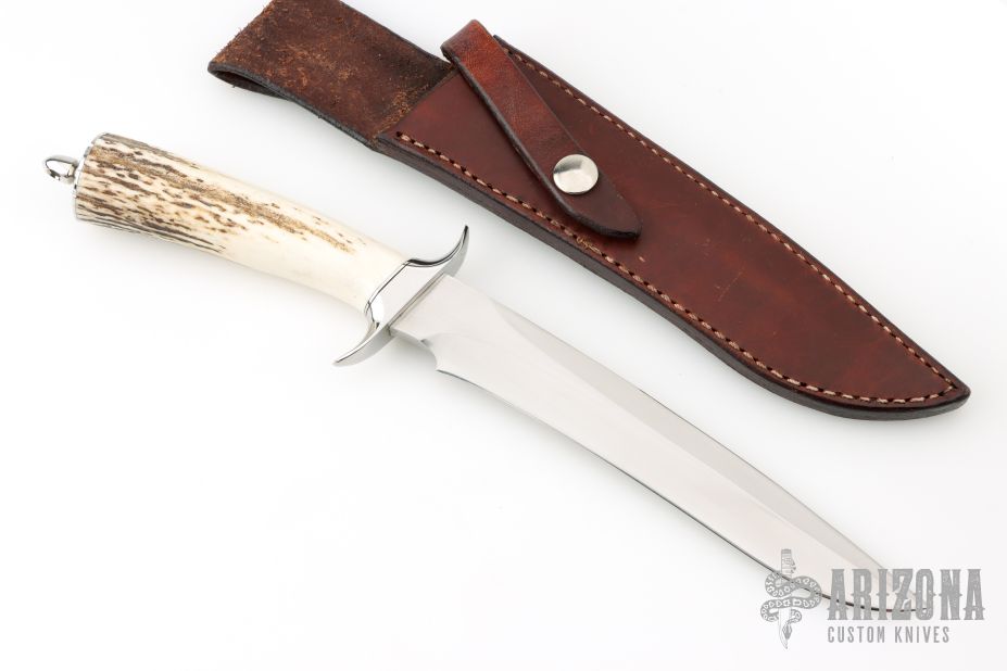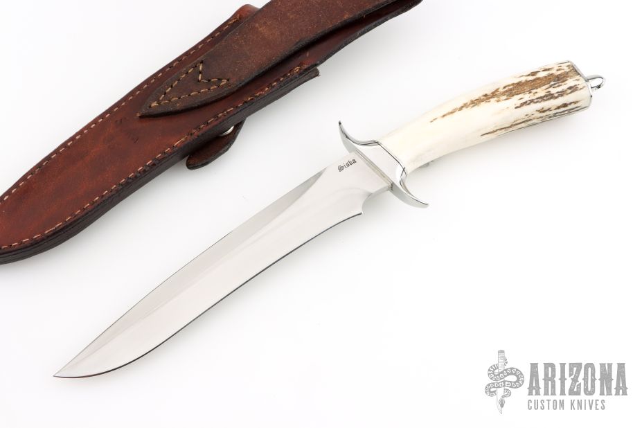 This fighter by the Late Jim Siska features a hand rub satin finished recurve blade with sharpened top edge, .272" blade thickness and 1.227" blade depth, hidden tang construction. The handle has a mirror polished stainless steel guard and butt cap and a beautiful stag grip with black/stainless steel spacers. Comes with a brown leather sheath. Excellent condition.