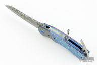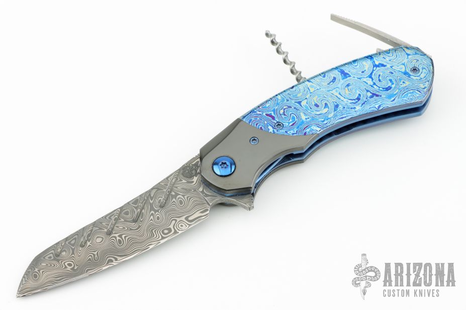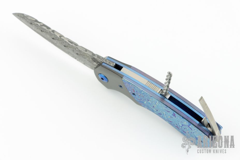 This linerlock flipper by Patrick Famin features Damasteel Damacore blade with both a front and rear flipper. The handle has zirconium bolsters, mokuti scales, anodized titanium liners with a tip up titanium clip with anodized edges. The backspacer opens up to reveal a corkscrew. Nice detent, lockup, action and blade seating. Has some light scratches otherwise the knife is in Excellent Condition.