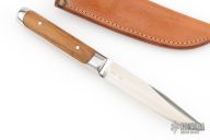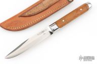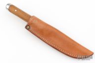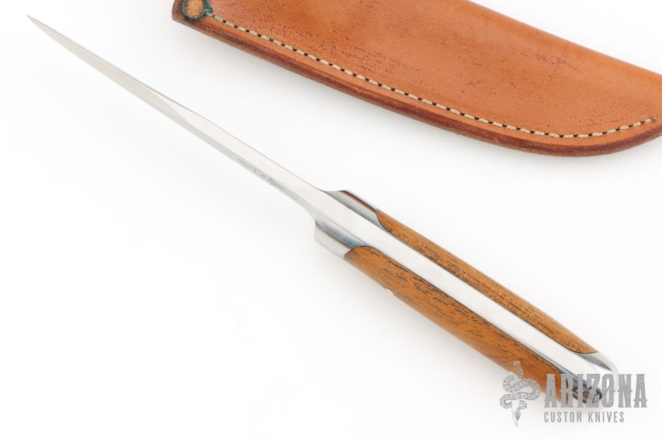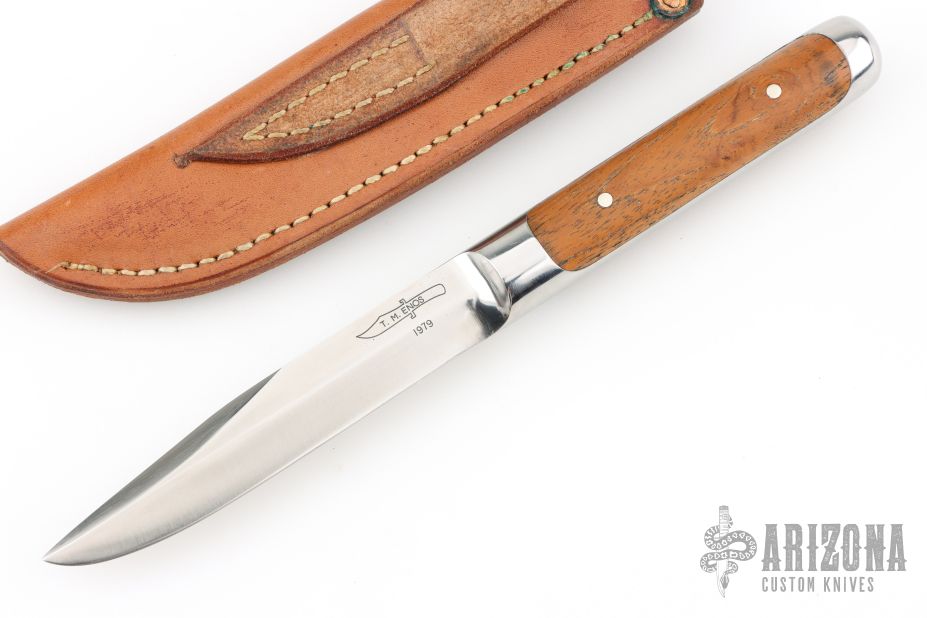 This Integral Round Spike Knife by TM Enos is dated 1979. It has a satin finished blade with false top edge, .210" blade stock and .747" blade depth, integral bolsters and tang with wood inlays. Comes with a brown leather sheath. #816. Excellent condition.