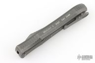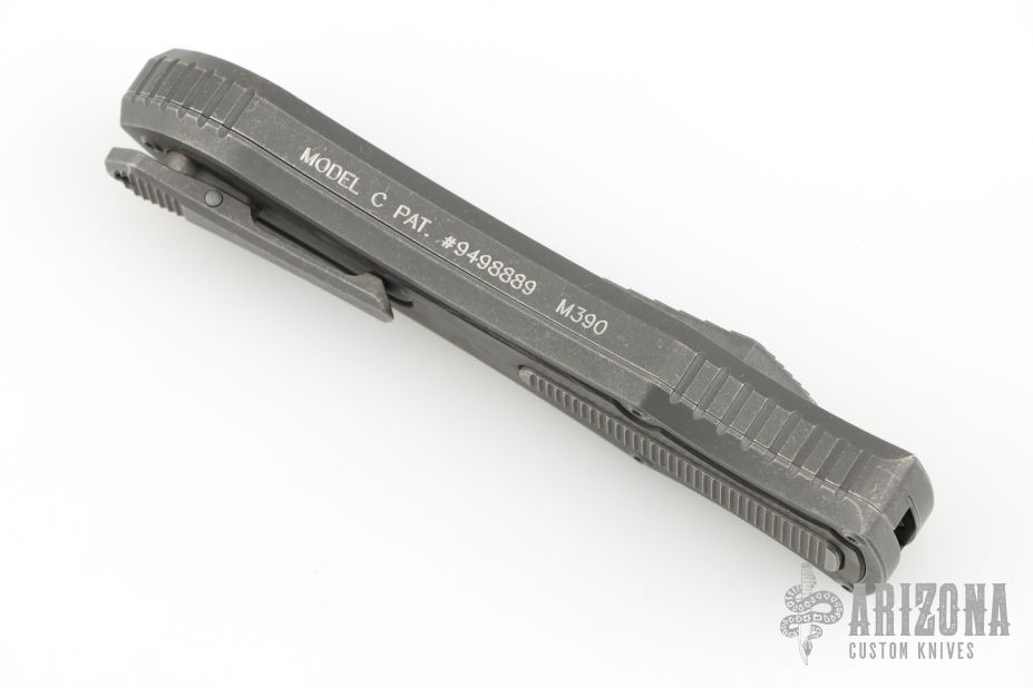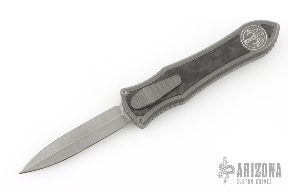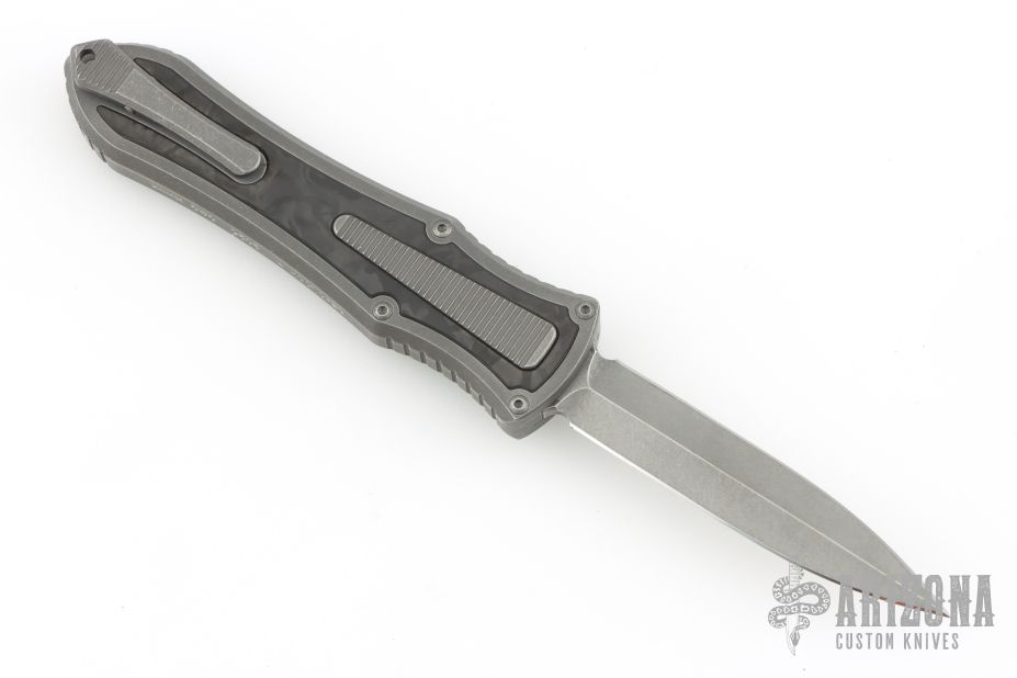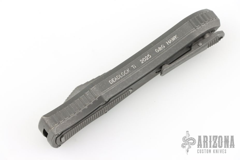 This knife is a Deadlock Model C by Grant and Gavin Hawk. It has a double-edged blade. The handle has a Fat Carbon inlays in the stonewashed titanium frame with a tip down spring clip, titanium. The thumb slide on the handle is also DLC titanium and handle has a DLC titanium overlay. Comes with original zippered case, tool and card. Grant and Gavin Hawk set out to create a double action OTF with no blade play.... They did it, NO blade play. Excellent condition. Comes with zippered case and tool.