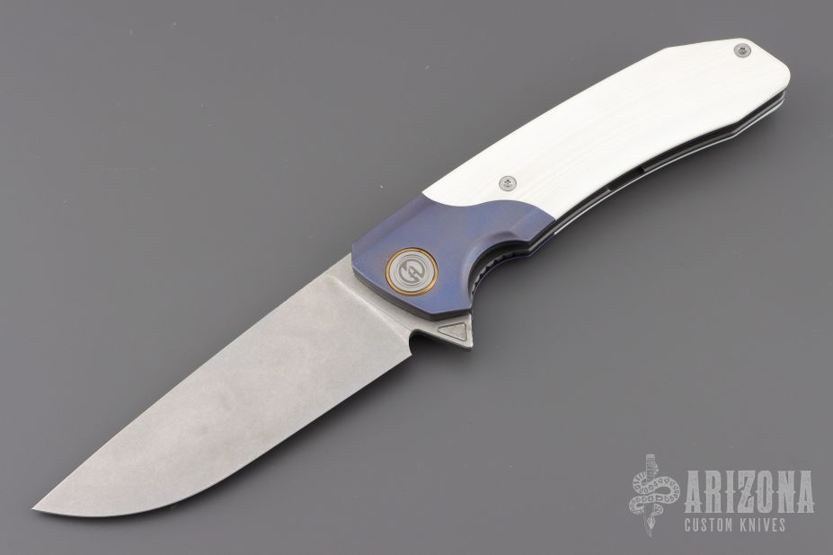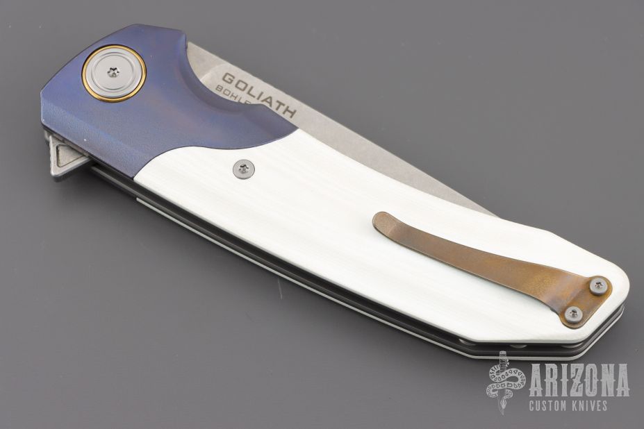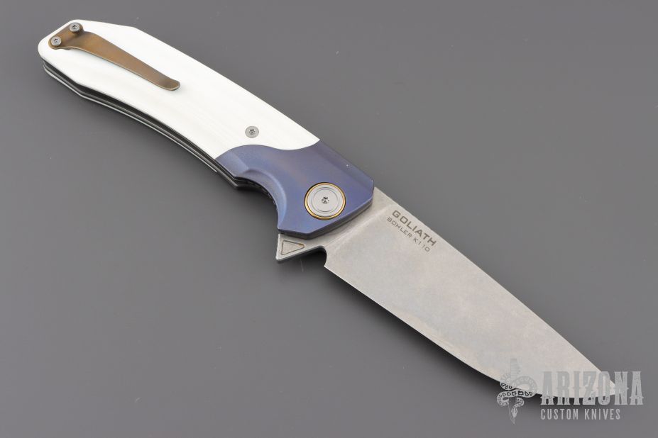 The Maxace Golaith 2.0 boasts Bohler K110 blade steel, effortless deployment, and an ergonomic titanium handle. Its drop point blade tackles heavy-duty cutting tasks and precision work with ease. This model has a stonewash finished blade and anodized/bead blasted titanium bolsters with white G-10 scales with an anodized titanium pocket clip.Includes the original box and papers. Excellent Condition.