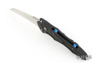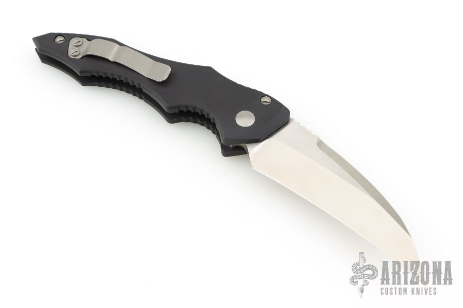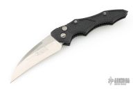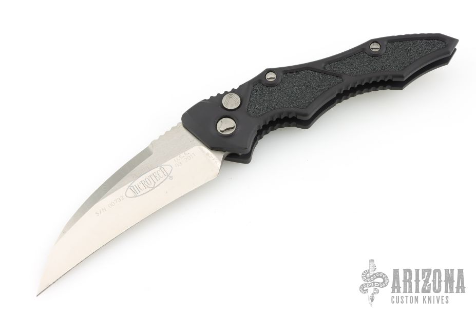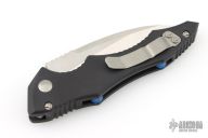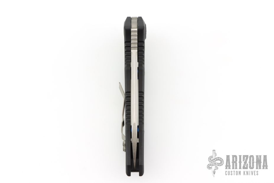 This Kestrel by Microtech is a side opening automatic has a satin finish blade with a standard edge and a black aluminum frame with non-slip inlays and blue posts. Stainless steel clip, tip up carry. Dated 03/2011 and s/n 00732. Excellent condition.