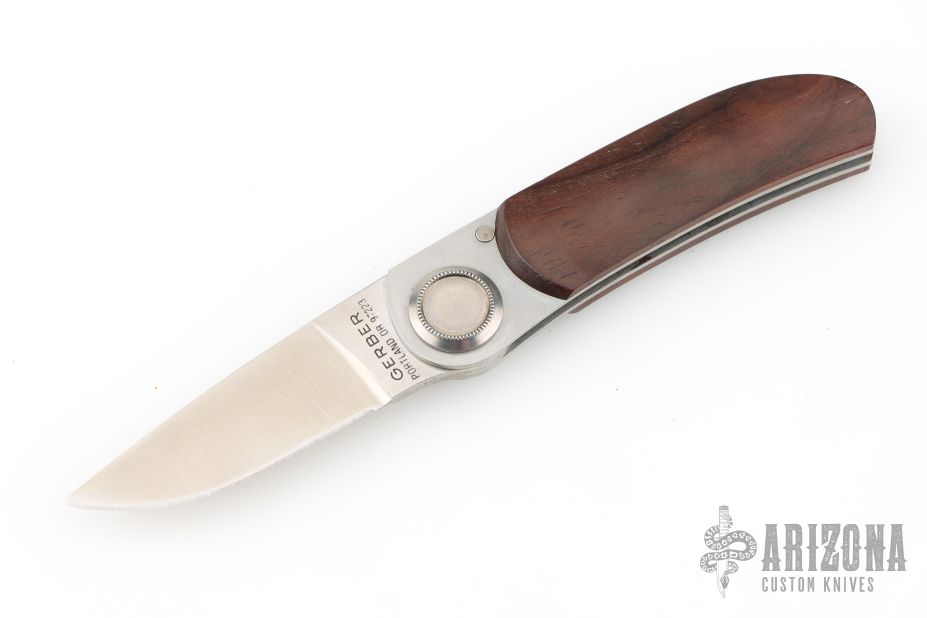 This Paul knife by Gerber has an axial locking mechanism. It has a satin finished blade, wood scales with a stainless steel frame. Comes with original box. Excellent condition.